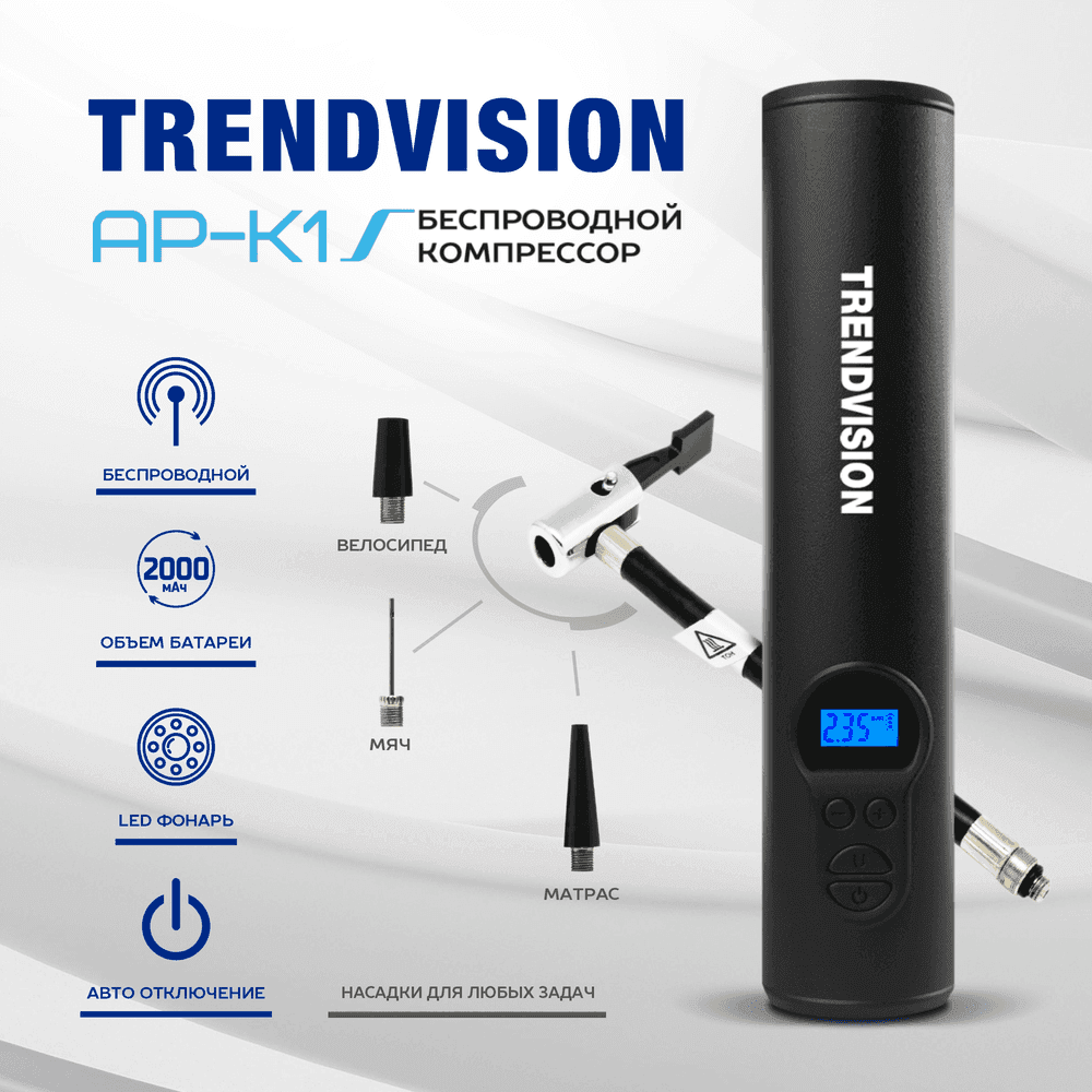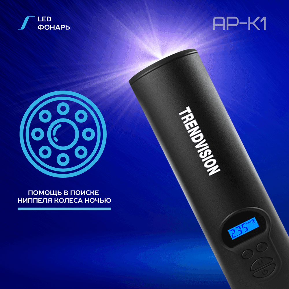 TrendVision AP-K1 - это беспроводной портативный автомобильный компрессор с мощностью 55 Вт и батареей емкостью 2000 мАч. Компрессор оснащен LED фонарем и цифровым LCD дисплеем для более точных показаний. Максимальноe давление выдаваемое компрессором: 150 PSI / 10 BAR.