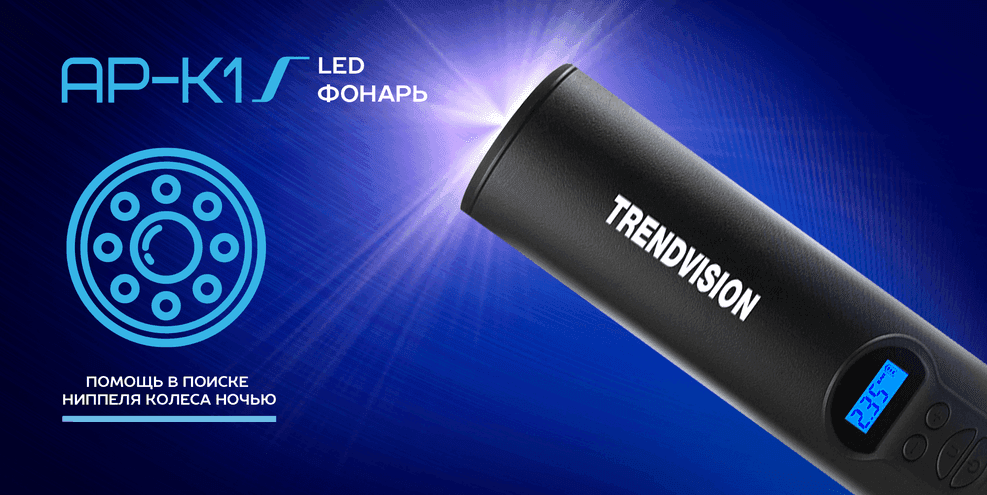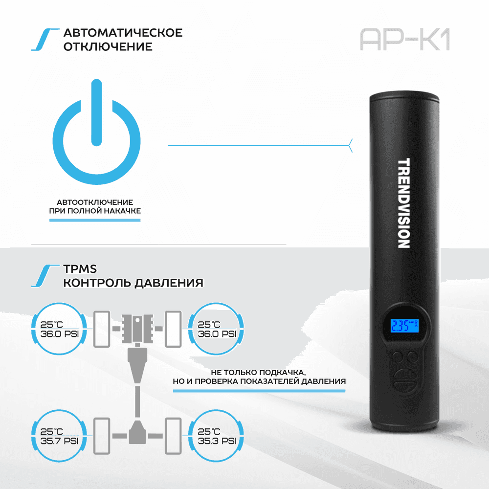 Одной из полезных функций в компрессоре TrendVision AP-K1 является система контроля давления в шинах (TPMS). Чтобы проверить давление в шине, необходимо всего лишь присоединить компрессор к шине. Давление автоматически высветится на цифровом дисплее (при условии, что компрессор включен).