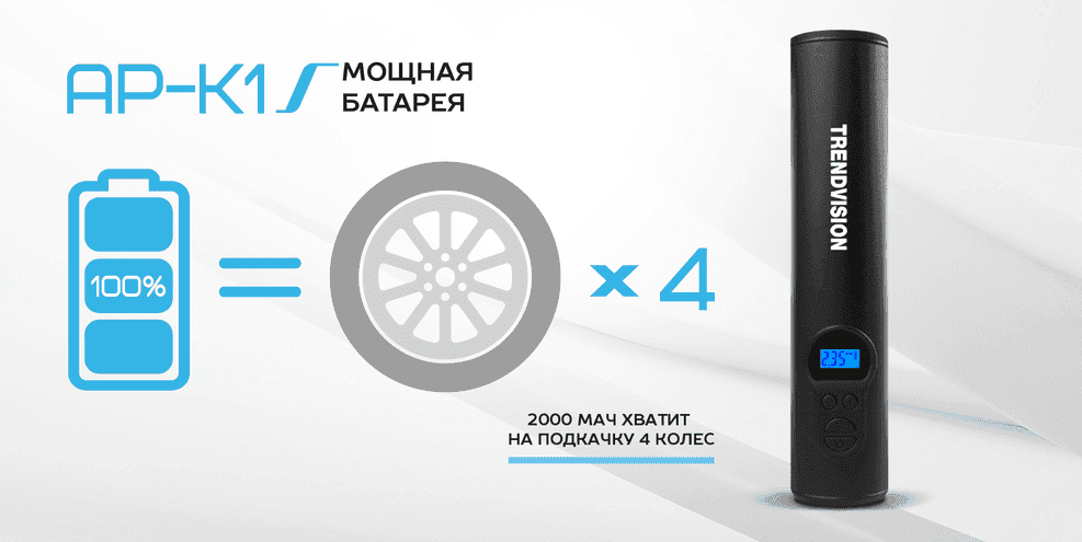 Беспроводной компрессор TrendVision AP-K1 оснащен мощной батареей общим объемом 2000 мАч. Полностью заряженный аккумулятор позволяет подкачать 4 колеса машины. Полная зарядка компрессора составляет примерно от 2 до 3 часов.