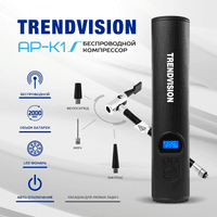 TrendVision AP-K1 - это беспроводной портативный автомобильный компрессор с мощностью 55 Вт и батареей емкостью 2000 мАч. Компрессор оснащен LED фонарем и цифровым LCD дисплеем для более точных показаний. Максимальноe давление выдаваемое компрессором: 150 PSI / 10 BAR.