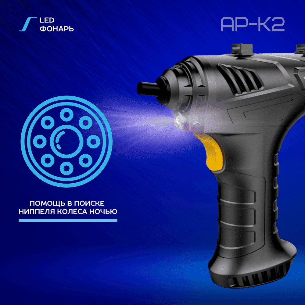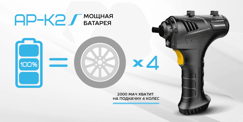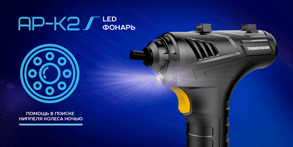TrendVision AP-K2 - это беспроводной портативный автомобильный компрессор, мощностью 50 Вт, с батареей емкостью 2000 мАч и автоматическим выключением по достижении заданного давления. Максимальное давление выдаваемое компрессором - 150 PSI или 10 BAR. Компрессор оснащен LED фонарем и LCD дисплеем для более точных показаний.