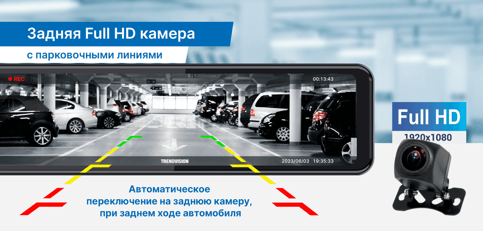 В комплекте TrendVision CarPlay Mirror имеется выносная задняя камера, которая снимает в разрешении Full HD (1920x1080p). Камера может использоваться как для видеофиксации происходящего за автомобилем во время пути, так и для безопасной парковки. При подключении задней камеры к бортовой системе автомобиля и включении задней передачи, на экране видеорегистратора автоматически появляется изображение с задней камеры, на которое наложены парковочные линии – они позволяют точно сориентироваться в расстоянии до объектов позади машины.