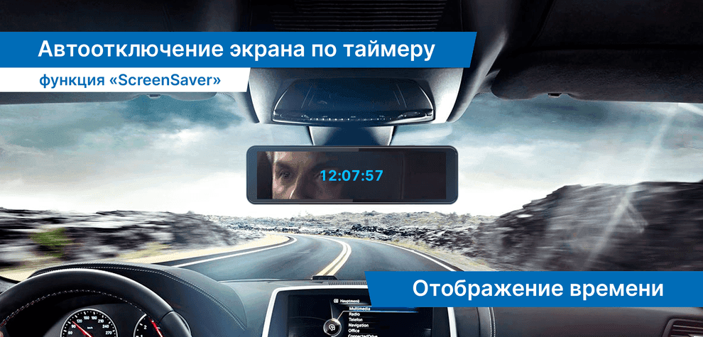 Есть возможность настроить таймер выключения экрана видеорегистратора с помощью функции ScreenSaver. После выключения, на 30 секунд на дисплее устройства появится актуальное время. При выключенном экране, устройством можно пользоваться как обычным штатным зеркалом заднего вида.