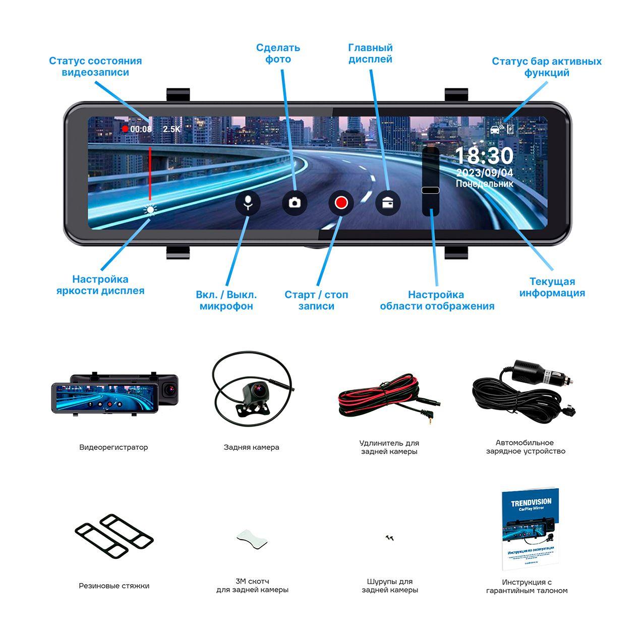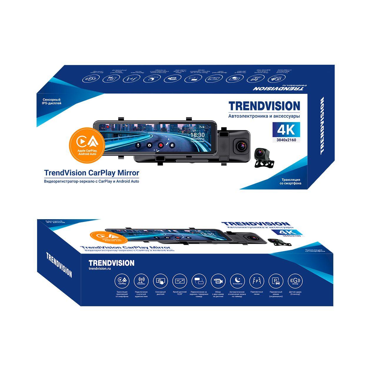 TrendVision CarPlay Mirror – 2-камерный автомобильный видеорегистратор-зеркало с качеством съёмки 4К или реальным 2К. Благодаря современной технологии "Apple CarPlay" и "Android Auto" можно транслировать приложения со смартфона прямо на большой сенсорный IPS экран устройства. Все это дополнено обширным классическим функционалом подобного вида устройств TrendVision и гибкой настройкой большого количества параметров.
