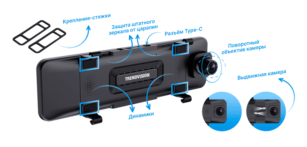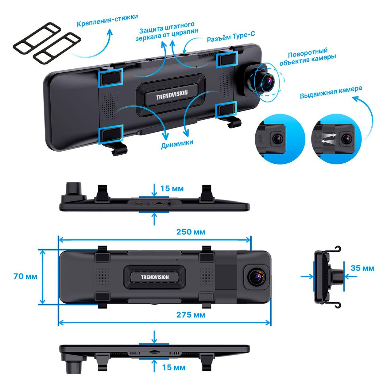 Быстросъёмные крепления-стяжки позволяют легко установить видеорегистратор на штатное зеркало практически в любом автомобиле. Аппарат не оставит царапин или ещё каких-либо повреждений на штатном зеркале, так как на задней стороне видеорегистратора есть специальные прорезиненные платформы. А на тот случай, если зеркало вашего автомобиля шире, чем TrendVision CarPlay Mirror, у аппарата присутствует выдвижной механизм, благодаря которому камера всегда будет направлена на дорогу. Также объектив может прокручиваться в разные стороны, поэтому всегда можно настроить кадр под собственные нужды.