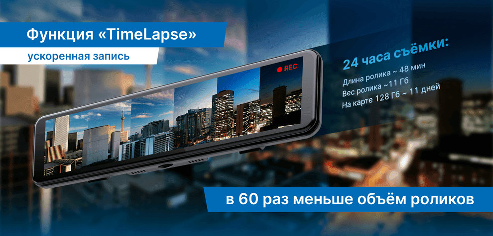 Функция «TimeLapse» позволяет вести «ускоренную» съемку видео, установив временной минимальный интервал между кадрами. Это будет полезно для значительной экономии места на карте памяти и сохранения данных с видеофиксации за несколько суток съёмки. Может особенно пригодиться в случае, если необходимо вести съёмку во время стоянки авто или дальней поездки по трассе.