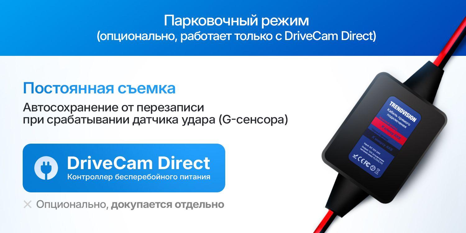 Контроллер бесперебойного питания DriveCam Direct поставляется в комплекте только с моделью TrendVision DriveCam Real 4K GPS Max. Для версий TrendVision DriveCam Real 4K GPS и TrendVision DriveCam Real 4K GPS 2CH его необходимо приобрести отдельно.