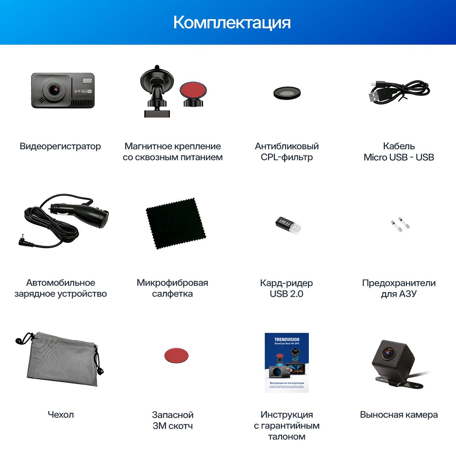 Видеорегистратор с реальным разрешением 4К Ultra HD, управлением через смартфон) и встроенным GPS-информером. Кабель прямого подключения TrendVision DriveCam Direct (+парковочный режим) в комплекте