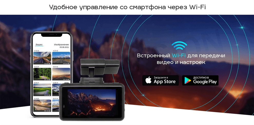 Аппарат оснащён встроенным Wi-Fi модулем, который позволяет управлять устройством (настройка, запись и просмотр видео) прямо с мобильного телефона. Удобное приложение «TV.DRIVE CAM», созданное специально для TrendVision DriveCam Real 4K Signature, можно скачать в App Store и Google Play. (Подключение к приложению на смартфоне осуществимо только от оригинального зарядного устройства или зарядного устройства с параметрами заявленными в характеристиках).