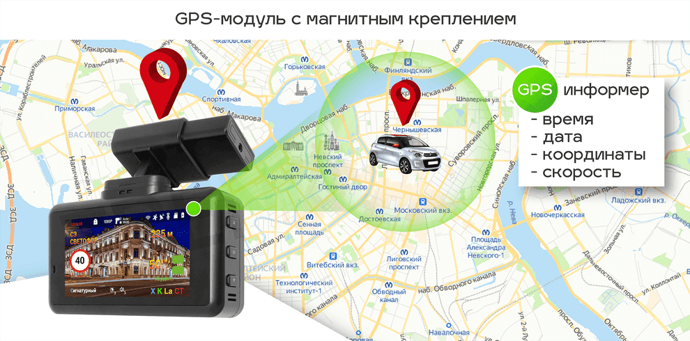 Благодаря встроенному GPS-модулю, аппарат синхронизируется со спутником и автоматически предоставляет актуальные дату, время, скорость и точные координаты. Это обеспечивает весомой доказательной базой в случае ДТП.