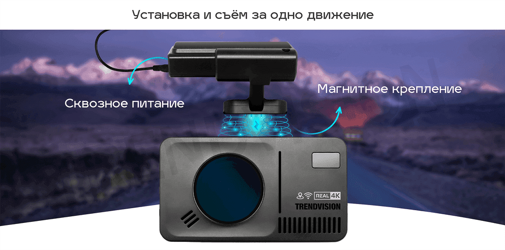 Благодаря магнитному креплению надежно установить и легко снять видеорегистратор можно одним движением руки. При подключении к креплению, устройство автоматически включится и начнёт запись. Никаких лишних действий.