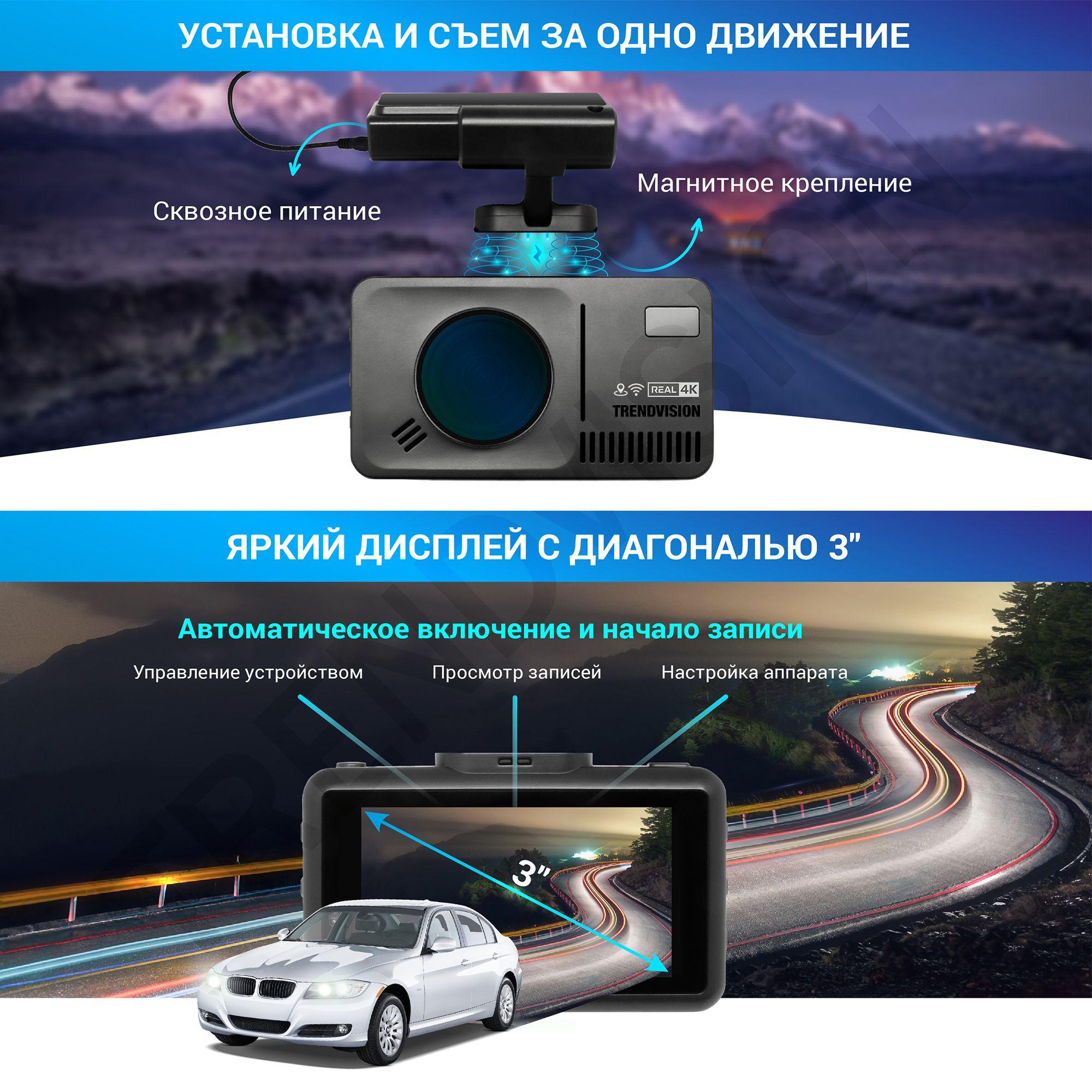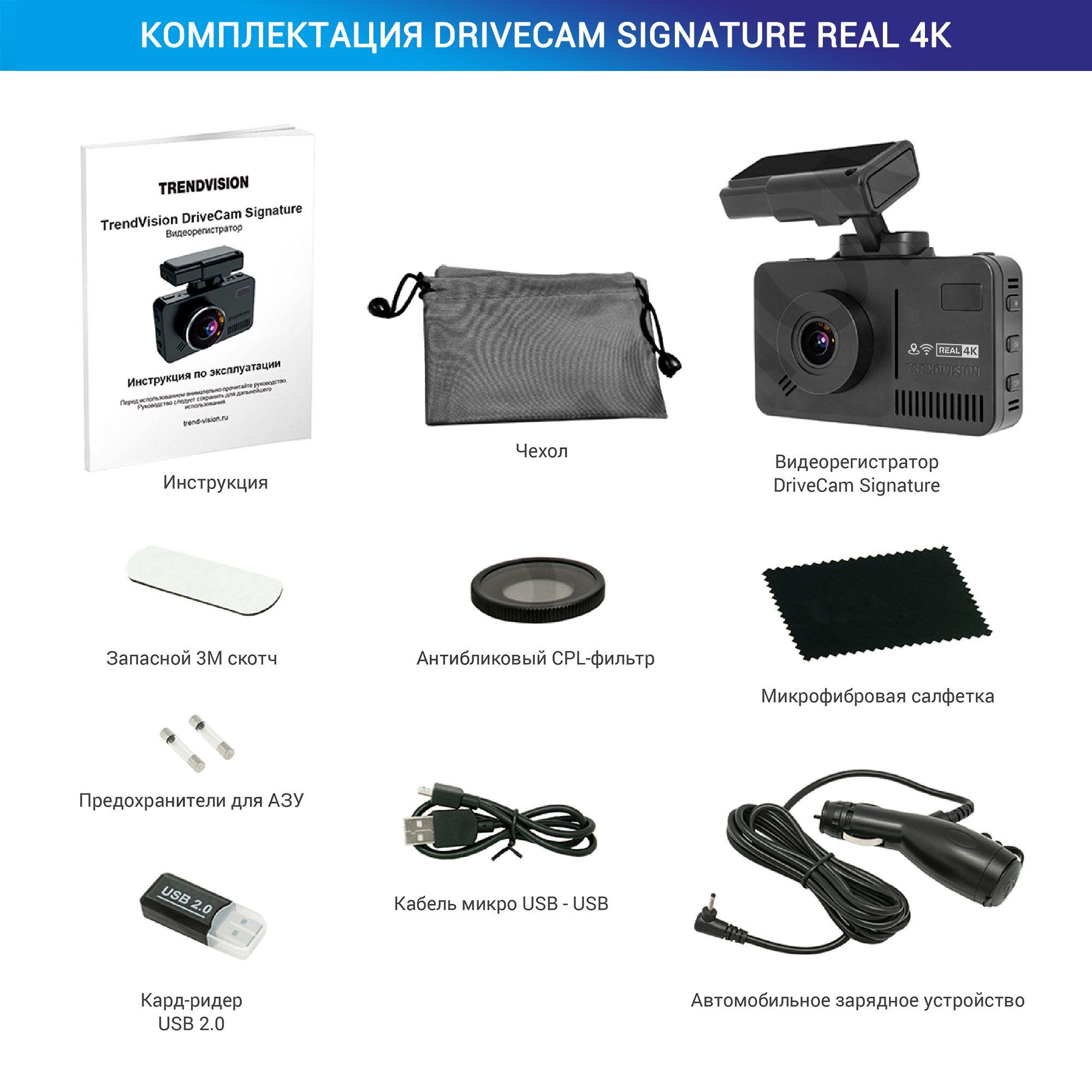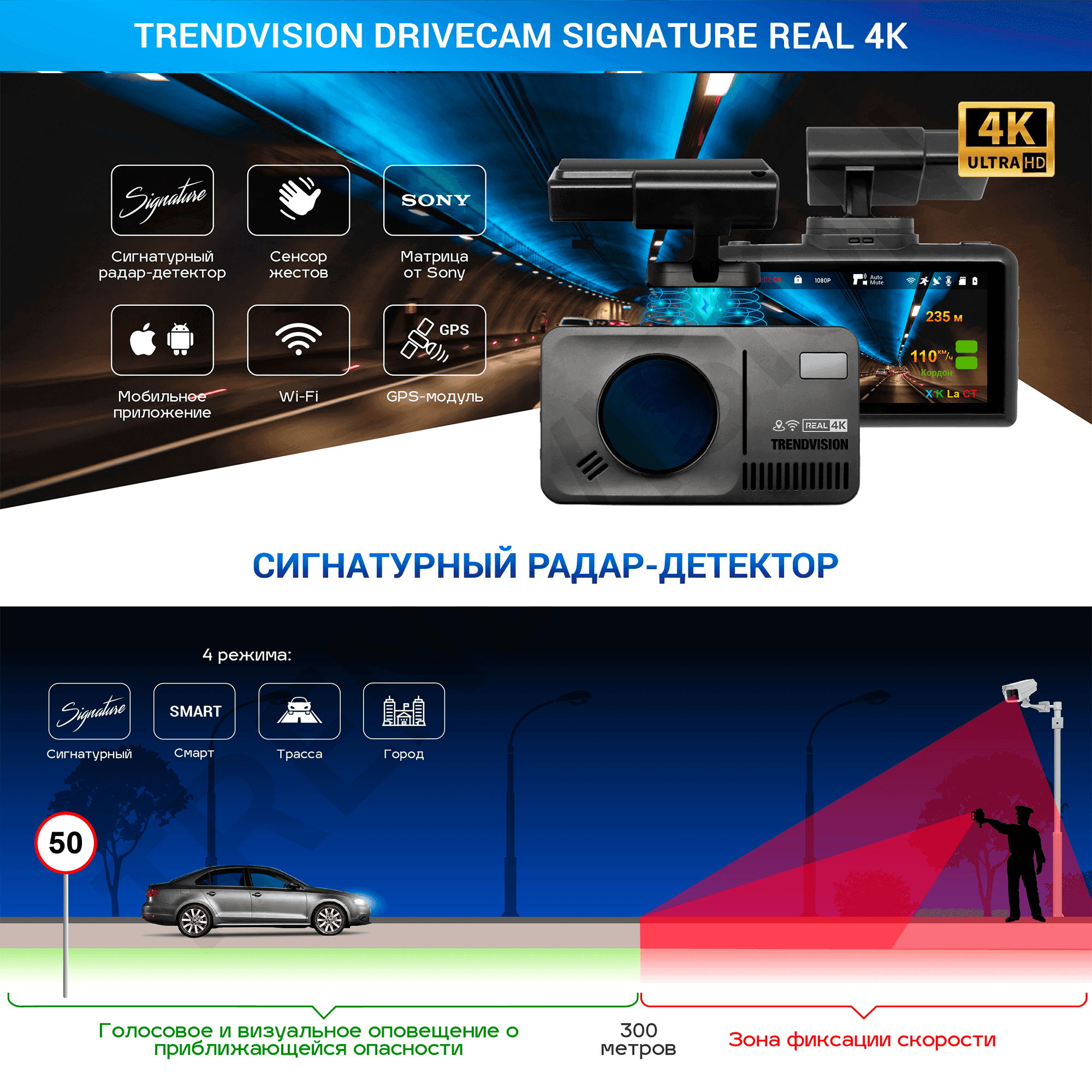 TrendVision DriveCam Real 4K Signature - инновационное комбо-устройство 3 в 1, включающее в себя видеорегистратор с реальным разрешением съёмки 4K (Ultra HD), сигнатурный радар-детектор с 4 режимами и GPS-информатор. Также, аппарат обладает возможностью управления и просмотра видео через мобильное приложение, благодаря встроенному Wi-Fi. Сенсор жестов позволяет одним взмахом руки отключить звук на аппарате или сделать фото.