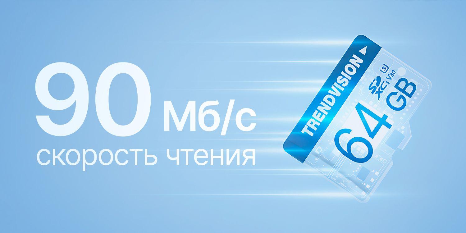 Высокоскоростная карта памяти с объёмом 64 Гб, скоростью записи 50 Мб/с, скоростью чтения 90 Мб/с и стандартами U3, V30, А1. Переходник-адаптер в комплекте.