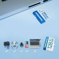 Высокоскоростная карта памяти с объёмом 128 Гб, скоростью записи 50 Мб/с, скоростью чтения 90 Мб/с и стандартами U3, V30, А1. Переходник-адаптер в комплекте.