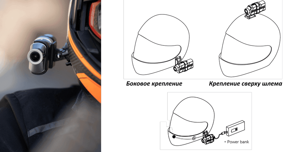 Крепление камеры может быть осуществляться как сбоку шлема, так и сверху в зависимости от индивидуальных предпочтений пользователя. Питание регистратора при этом может осуществляться либо от встроенного аккумулятора, либо от внешнего аккумулятора.