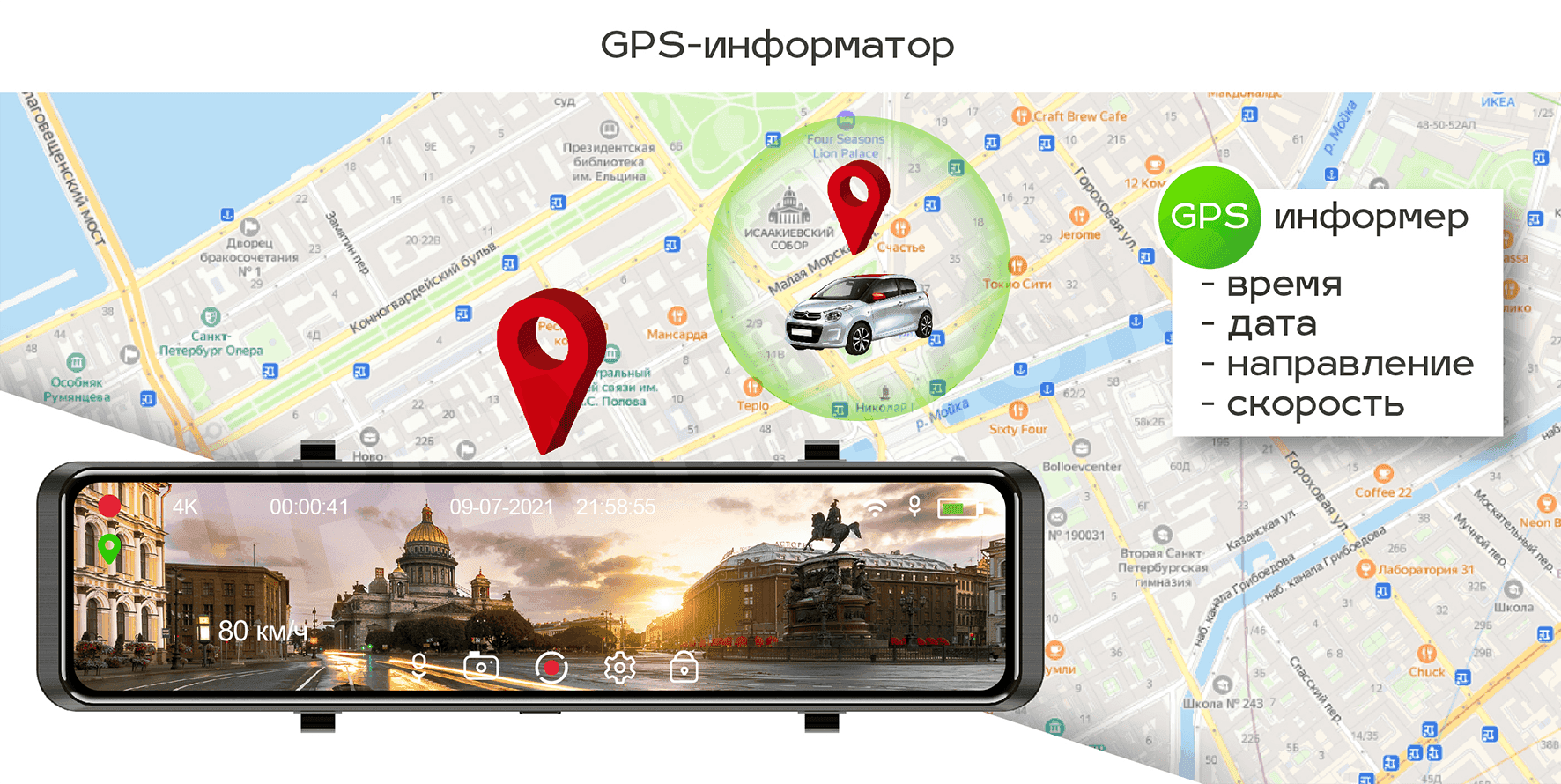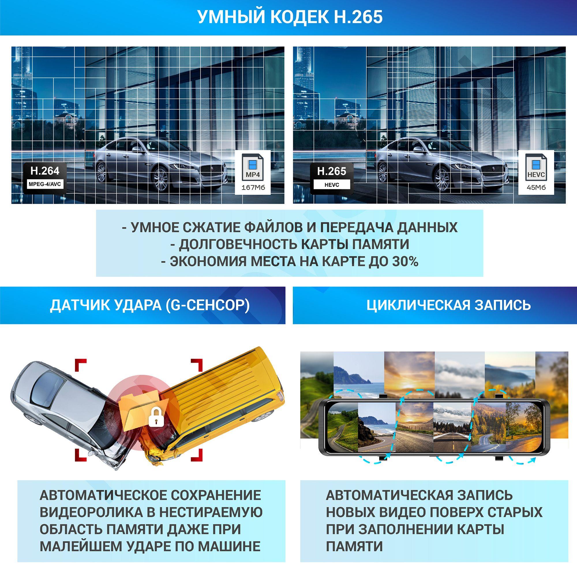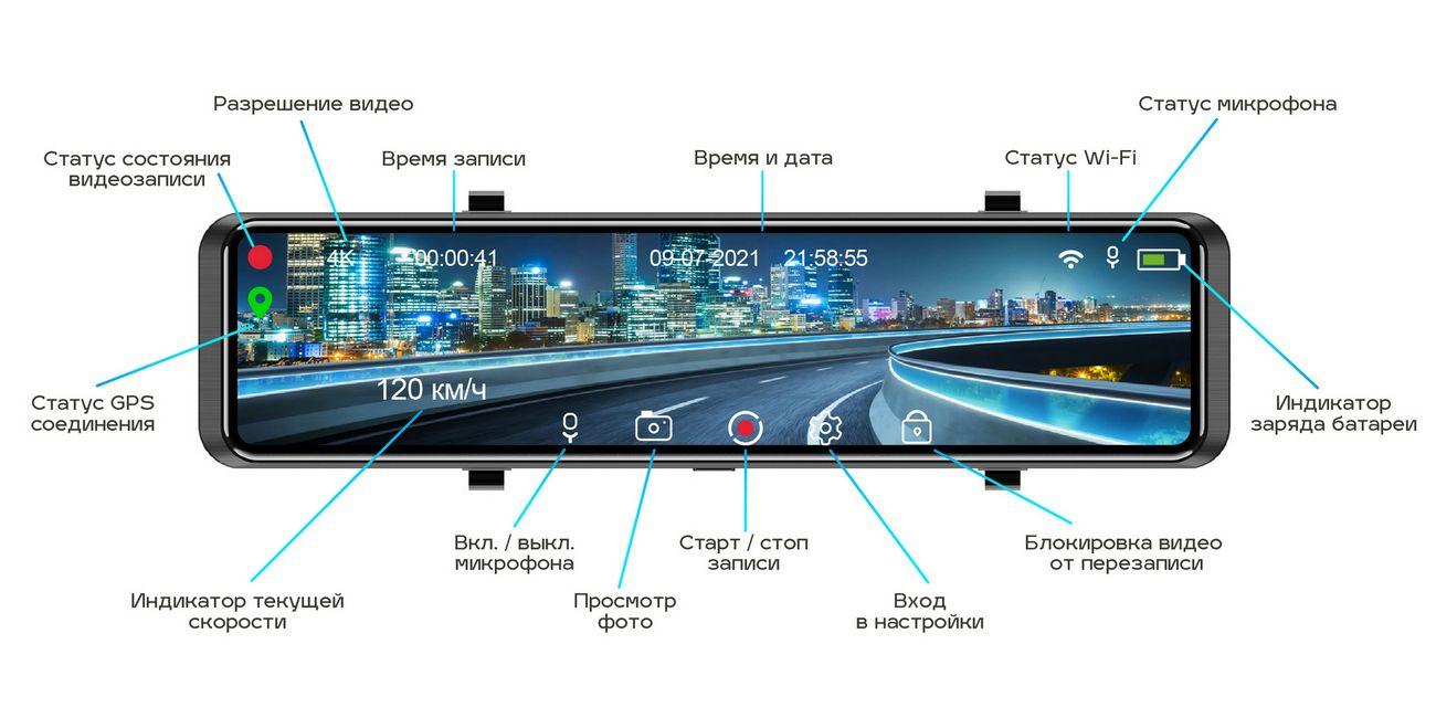 Автомобильный видеорегистратор в форме зеркала с двумя камерами (Real 4K Ultra HD + Full HD), работающий на новейшей матрице Sony IMX415 с 8Мп и скоростном процессоре Hi3559. Антибликовый CPL-фильтр и кабель постоянного питания HardWare Kit в комплекте.