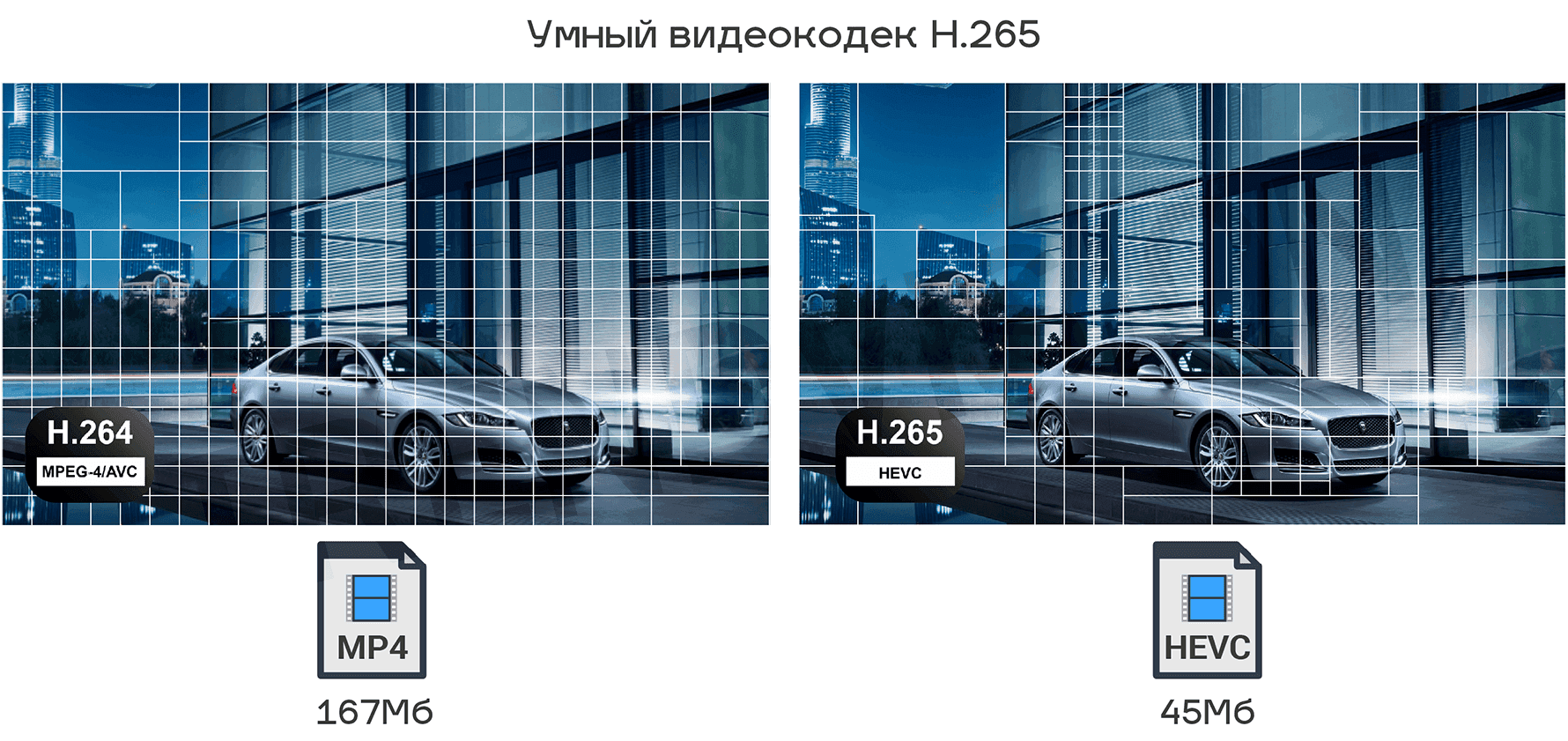 TrendVision MR-4K поддерживает как классический кодек H.264 (формат MP4), так и умный видеокодек нового поколения H.265 (формат HEVC), который значительно сжимает размеры итоговых видеофайлов (до 30% экономии места на карте памяти), сохраняя при этом качество изображения.