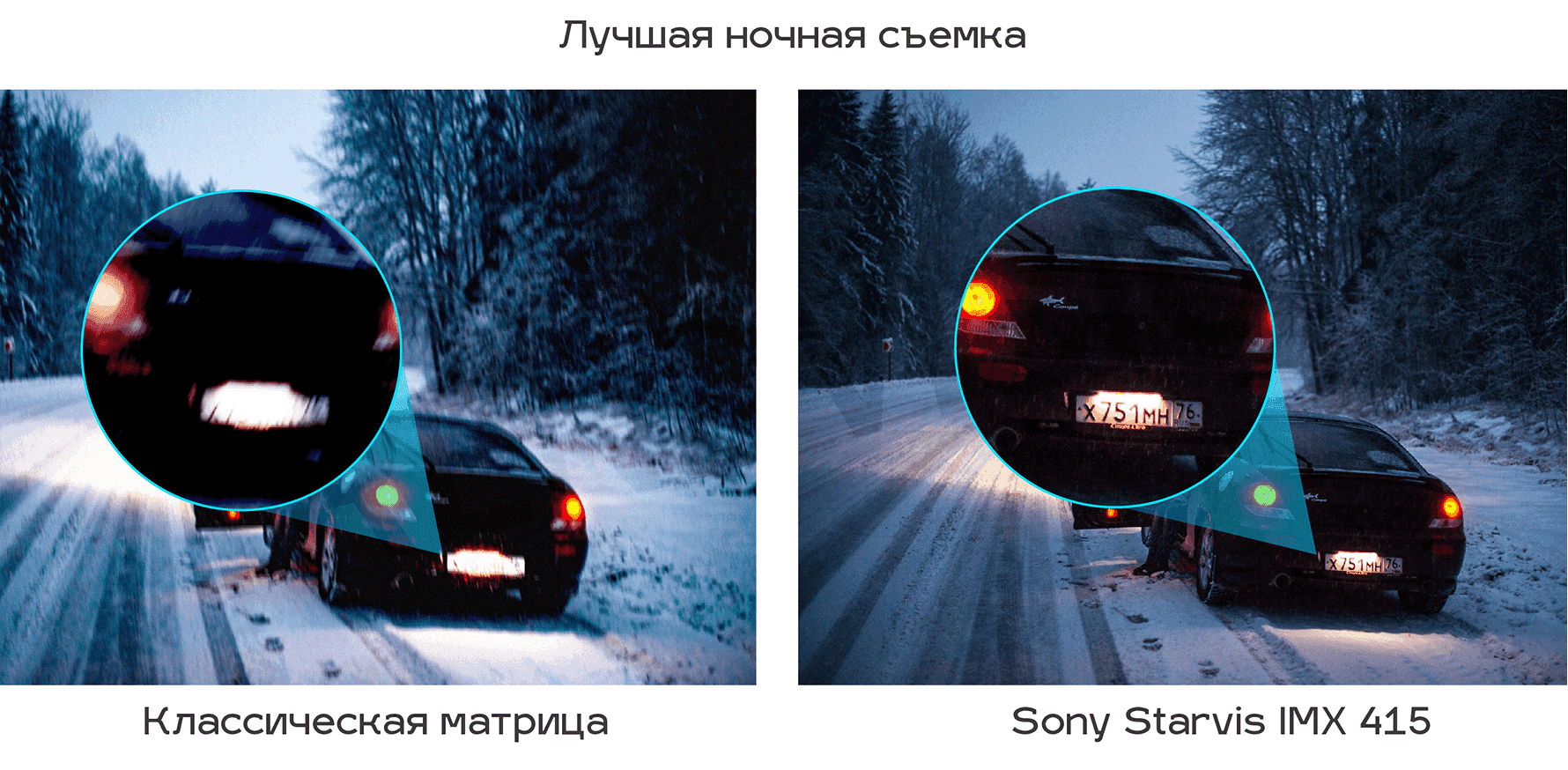 Благодаря лучшей матрице на рынке видеорегистраторов SONY STARVIS IMX 415, в сочетании с мощным процессором, в ночное время суток аппарат снимает на порядок лучше подавляющего большинства альтернативных видеорегистраторов. Вне зависимости от условий освещения, самые важные детали дорожных происшествий стабильно фиксируются даже на больших расстояниях.