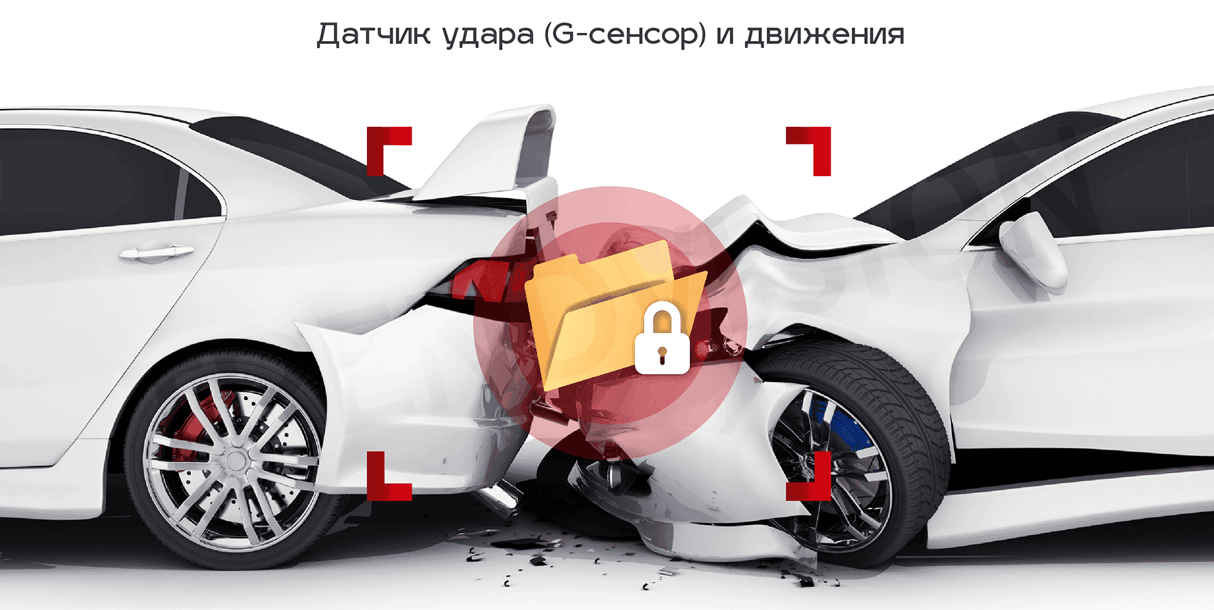 Аппарат оснащён датчиками, которые, даже при малейшем ударе или опасном движении в кадре, автоматически сохраняют записанный видеоролик в нестираемую область памяти. Благодаря этому важные для разрешения ДТП или кражи данные будут всегда защищены от перезаписи или удаления.