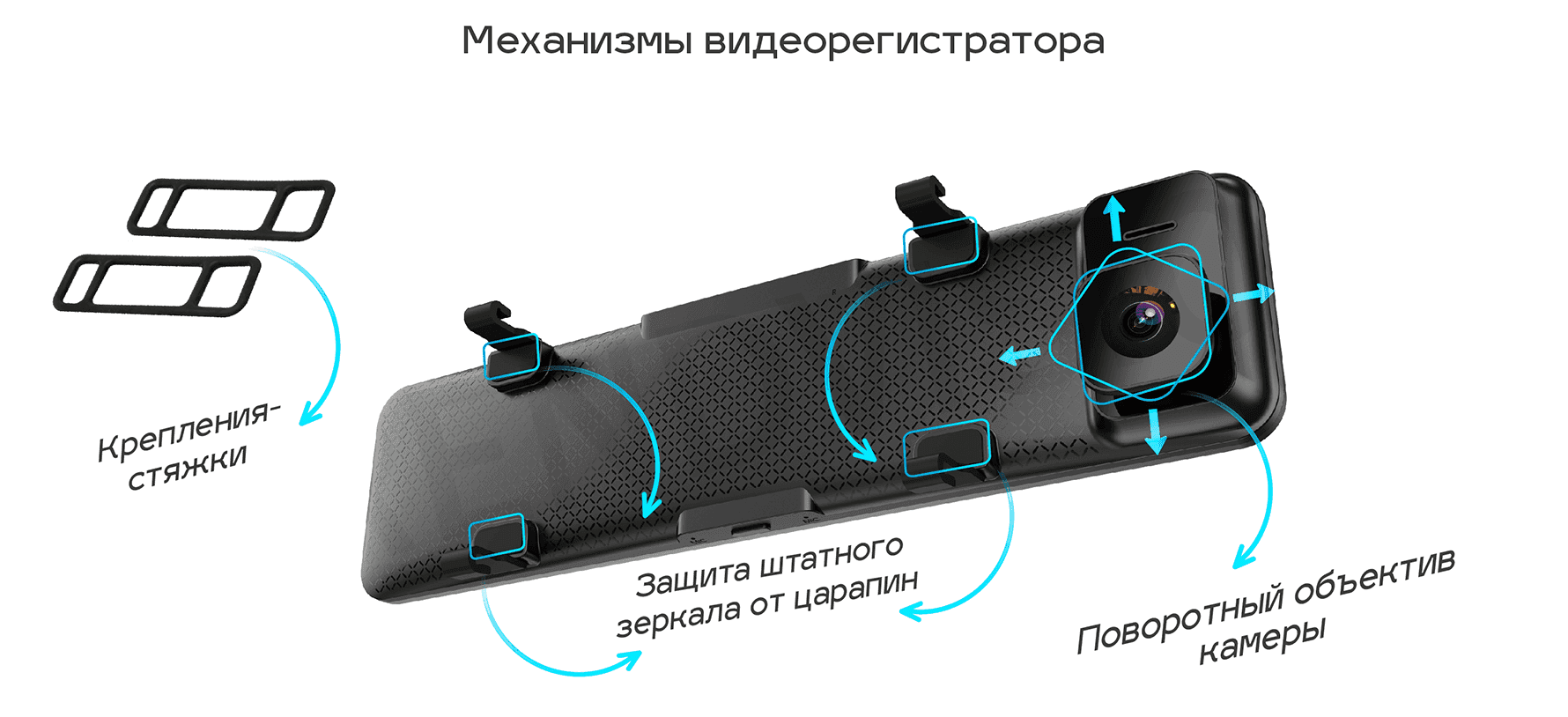 Быстросъёмные силиконовые крепления-стяжки обеспечивают легкую установку видеорегистратора-зеркала на штатное зеркало практически в любом автомобиле. Аппарат не оставит царапин или ещё каких-либо повреждений на штатном зеркале, так как на задней стороне видеорегистратора есть специальные прорезиненные платформы. Объектив способен прокручиваться в разные стороны, поэтому всегда можно правильно отрегулировать направление камеры и настроить кадр.