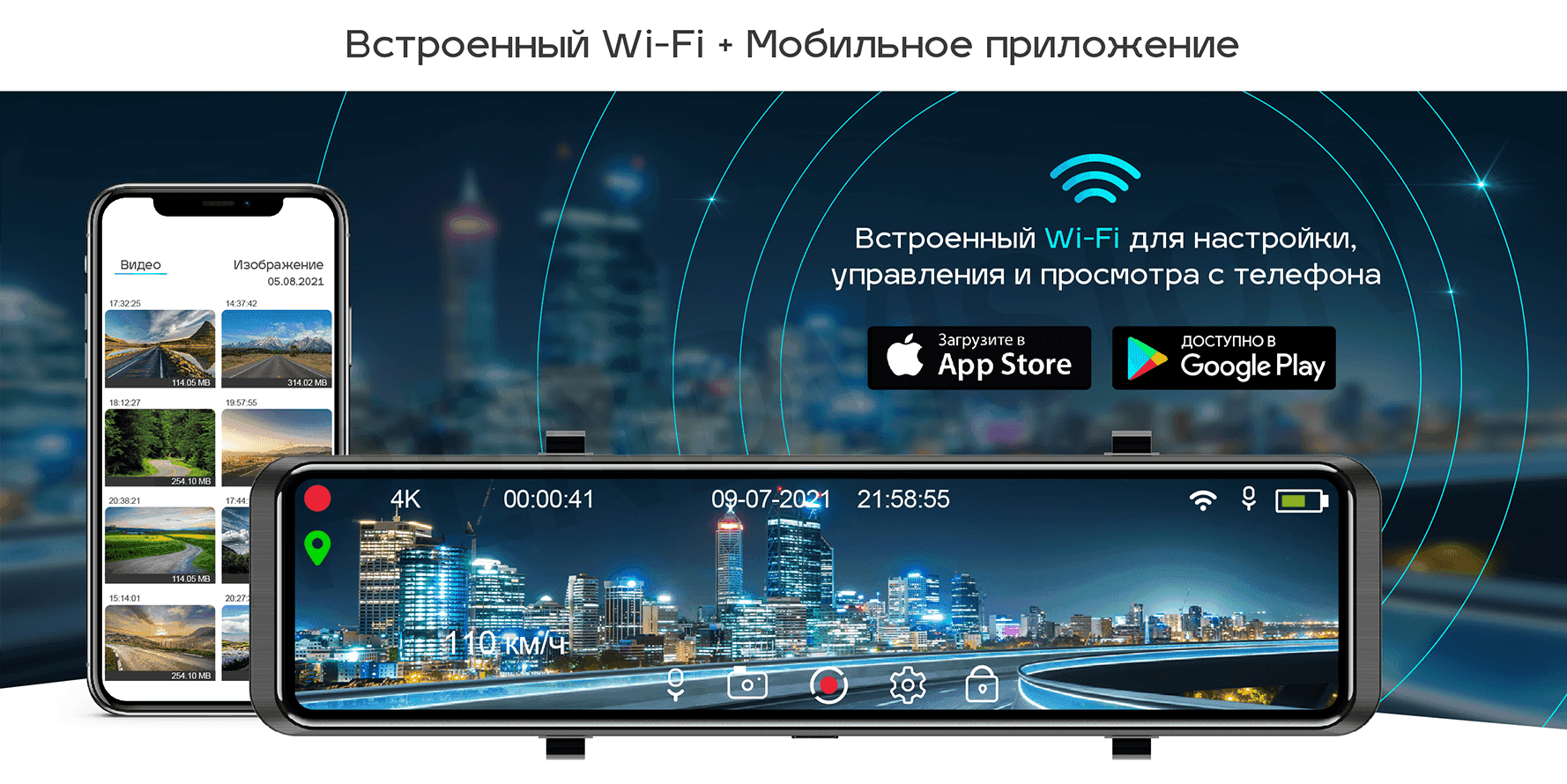 Встроенный Wi-Fi модуль обеспечивает синхронизацию со смартфоном, благодаря специальному мобильному приложению. Управление основными настройками видеорегистратора, а также скачивание и просмотр записанных видео можно производить прямо на экране вашего мобильного устройства. (Подключение к приложению на смартфоне осуществимо только от оригинального зарядного устройства или зарядного устройства с параметрами заявленными в характеристиках).