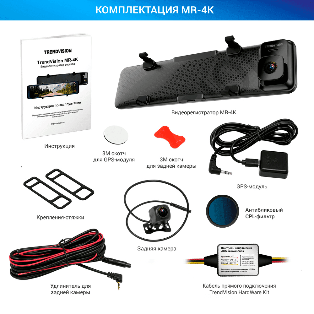 TrendVision MR-4K – автомобильный видеорегистратор в форме зеркала с двумя камерами (Real 4K Ultra HD + Full HD), работающий на новейшей матрице Sony IMX415 с 8Мп и скоростном процессоре Hi3559. Начинка аппарата составляет самые современные, необходимые для мощного видеорегистратора, возможности. Антибликовый CPL-фильтр и кабель постоянного питания HardWare Kit в комплекте.