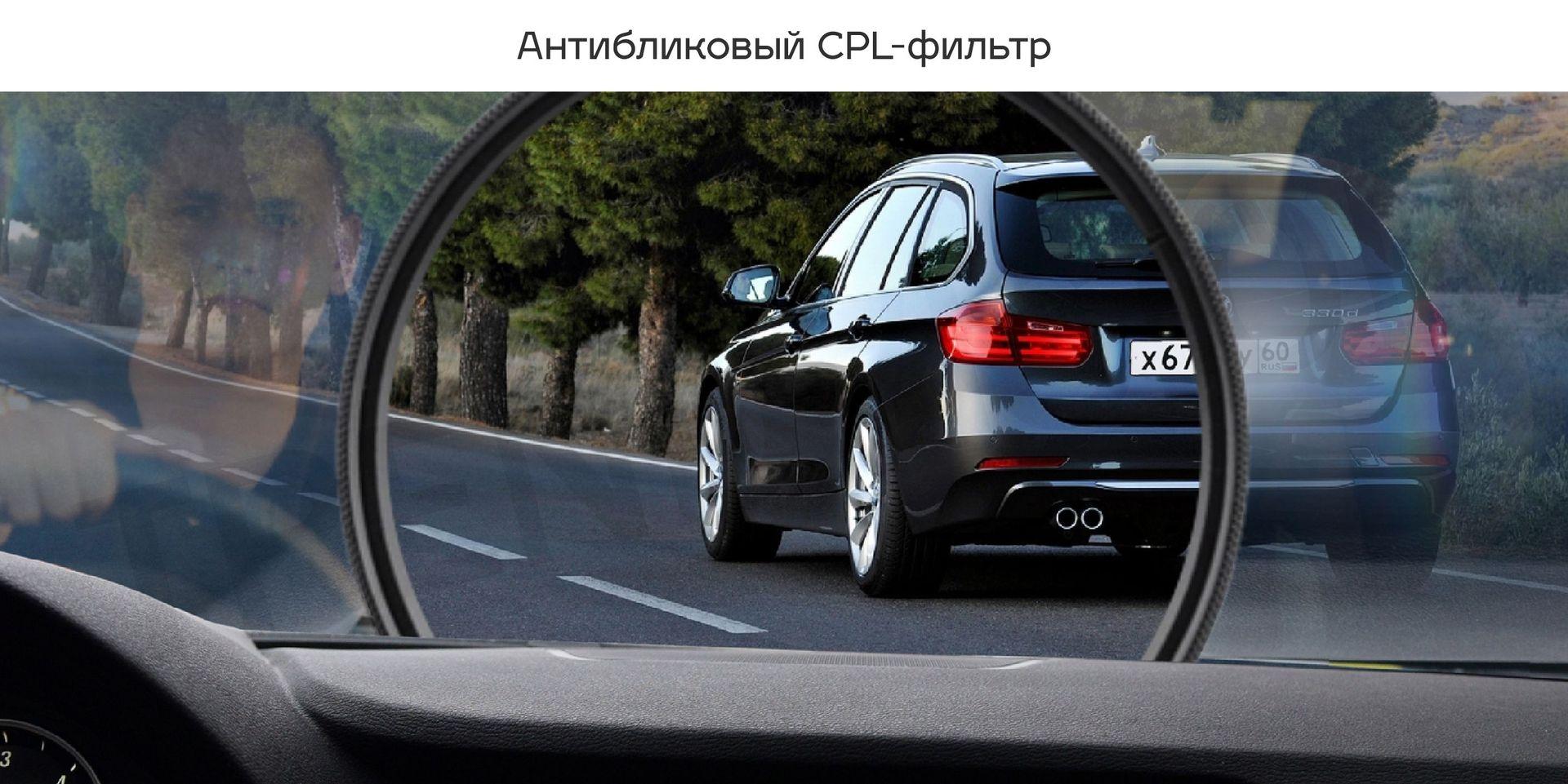 Устройство комплектуется CPL-фильтром, который подавляет солнечные блики и отражения от лобового стекла. С его использованием картинка становится чище и контрастнее, а важные элементы дорожной обстановки сохраняют высокую детализацию даже при ярком солнечном свете или сложных условиях освещения.
