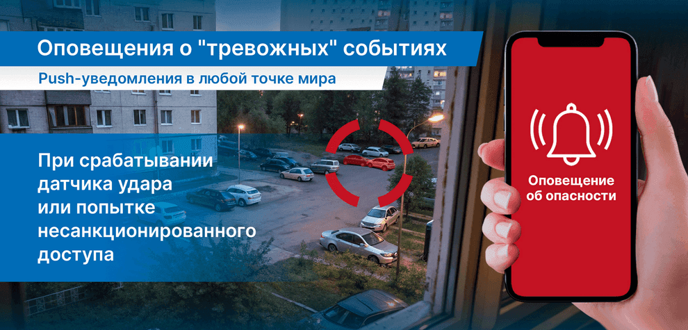 Система отправляет моментальные push-уведомления на смартфон владельца при срабатывании датчика удара или попытке несанкционированного доступа.