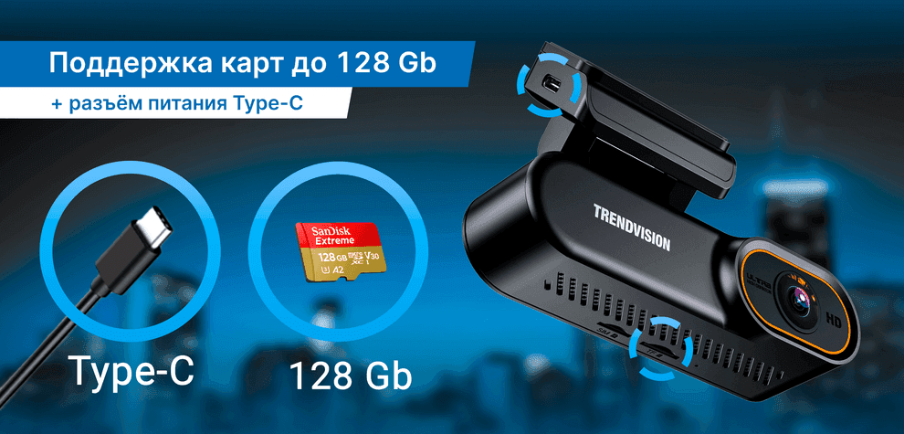 Компактный Full HD / 2K видеорегистратор с 4G онлайн-мониторингом через смартфон, уведомлениями о "тревожных" событиях и возможность двусторонней голосовой связи. Доп камера (для съёмки сзади или в салоне), антибликовый CPL-фильтр и кабель прямого подключения TrendVision HardWare Kit (+парковочный режим) в комплекте