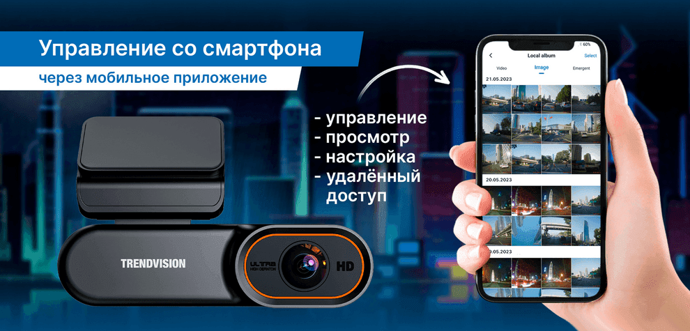 Полный контроль над устройством: просмотр записей, изменение настроек, удалённый доступ к информации и функциям регистратора через смартфон. ПО также скачивается и обновляется через смартфон.