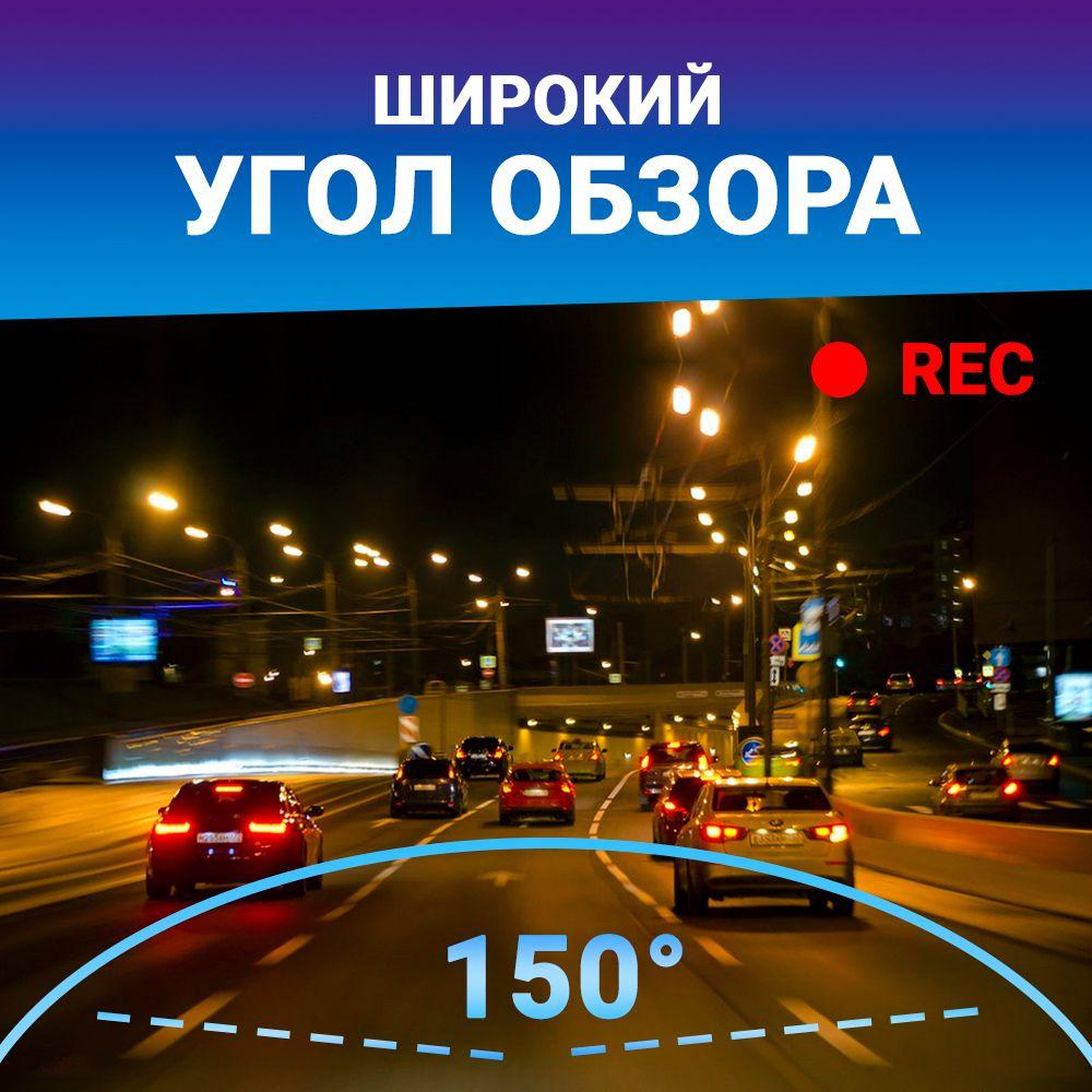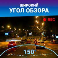 Угол обзора 150° фиксирует ситуацию не только перед капотом автомобиля, но и по всей ширине проезжей части, а также захватывает в кадр зону тротуара.
