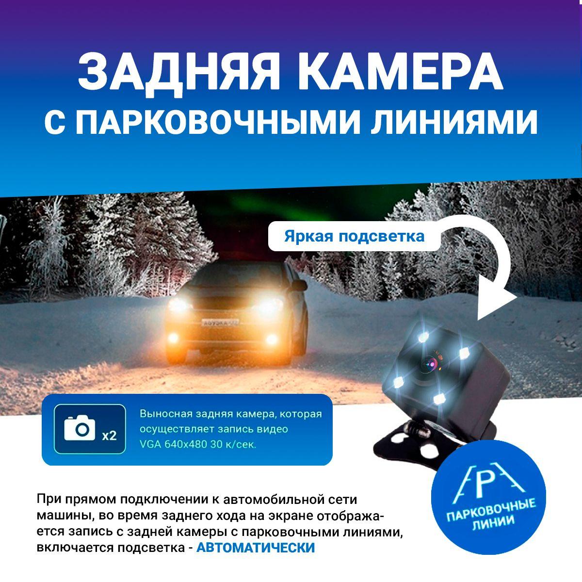 - При подключении задней камеры к бортовой системе автомобиля, при включении заднего хода, автоматически задняя камера отображается на экране с парковочными линиями и включается светодиодная подсветка, размещенная прямо на задней камере