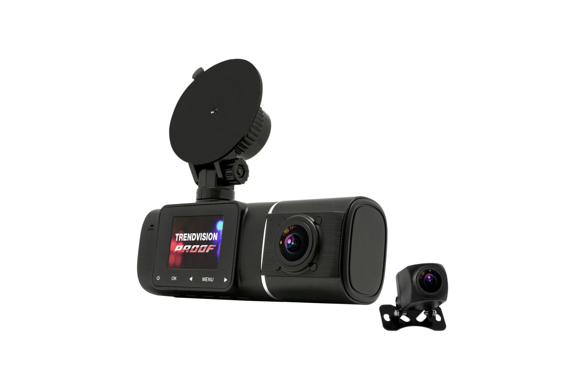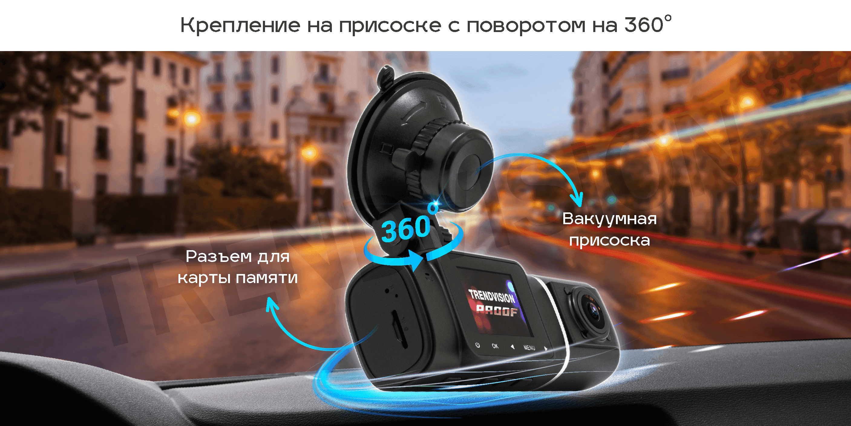TrendVision Proof 3CH GPS – компактный видеорегистратор с тремя камера: фронтальной Full HD + салонной HD (в одном корпусе) и задней выносной HD. Салонная камера вращается на 250° и имеет 4 ИК-светодиода – это позволяет вести улучшенную ночную съёмку в салоне автомобиля. GPS-модуль, автоматически определяющий дату, время, скорость и координаты - в комплекте.