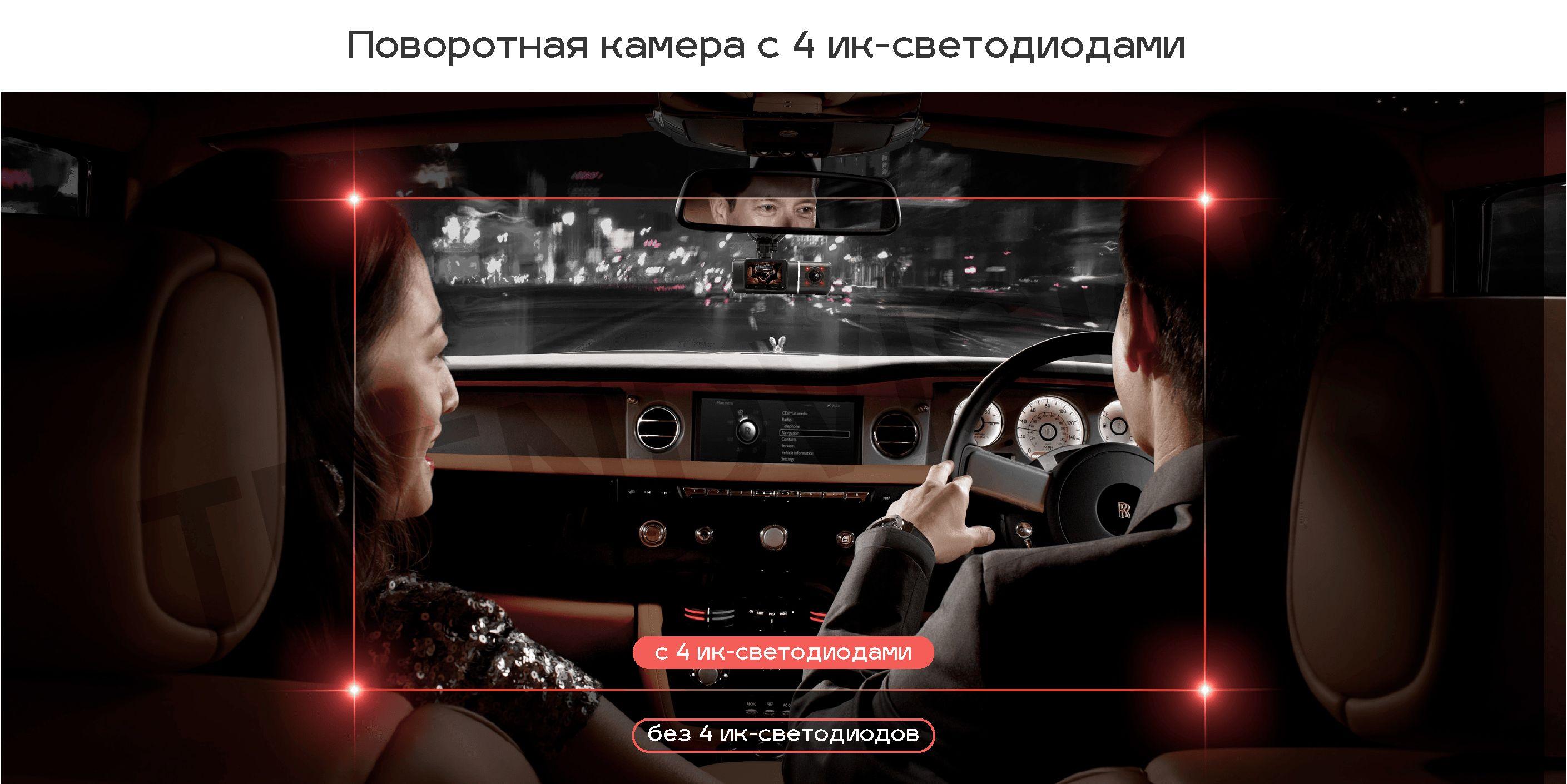 Вторая (HD) камера в корпусе аппарата поворачивается на 250° - есть возможность направить её в салон и фиксировать происходящее не только на дороге, но и внутри машины. К тому же, она оснащена 4 ИК-светодиодами, благодаря которым происходящее в салоне автомобиля будет видно даже в условиях полного отсутствия освещения.