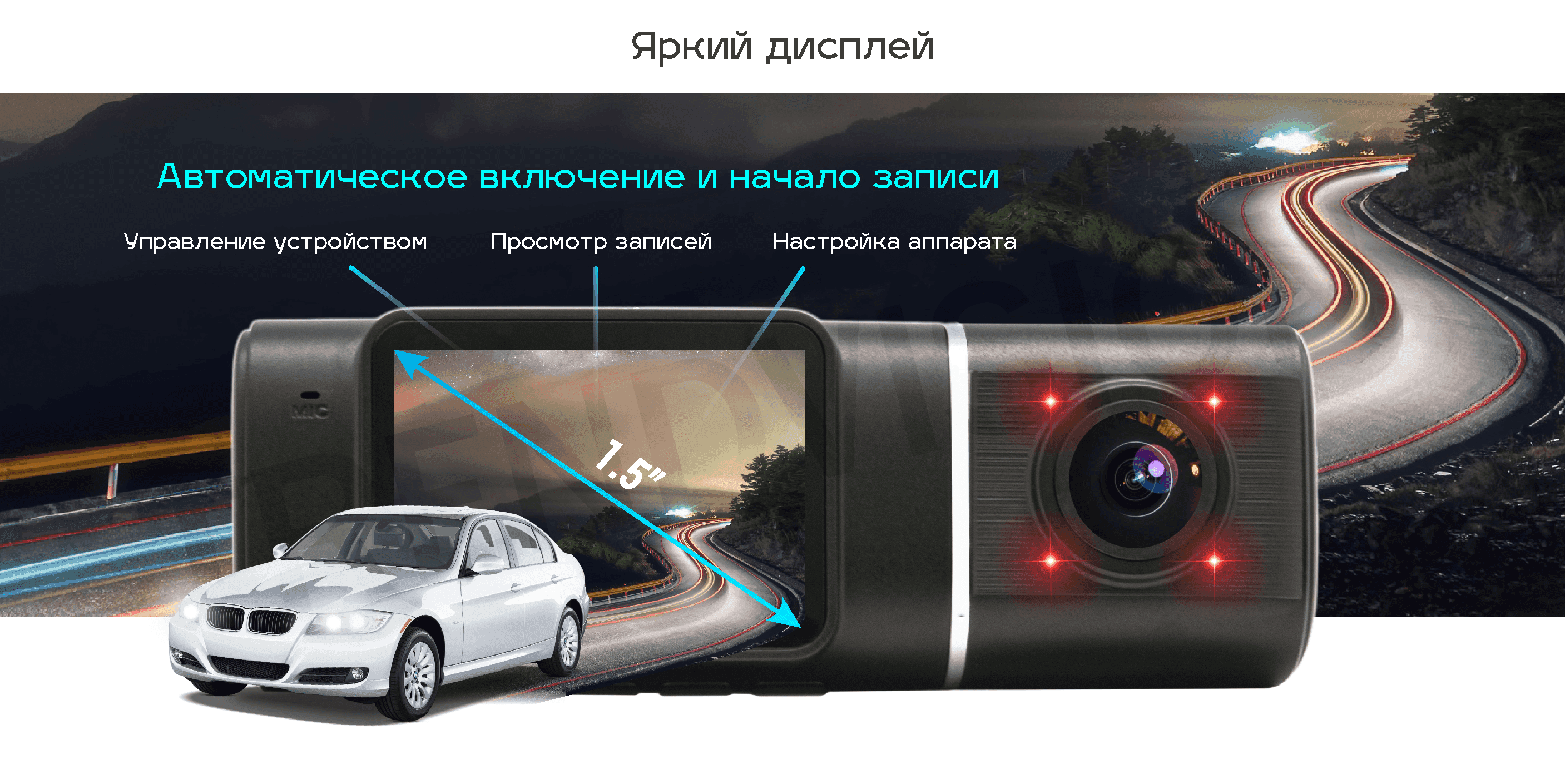 Компактный Full HD видеорегистратор с 2 камерами в 1 корпусе и 4 ИК-светодиодами для ночной съёмки. GPS-модуль и задняя камера в комплекте.