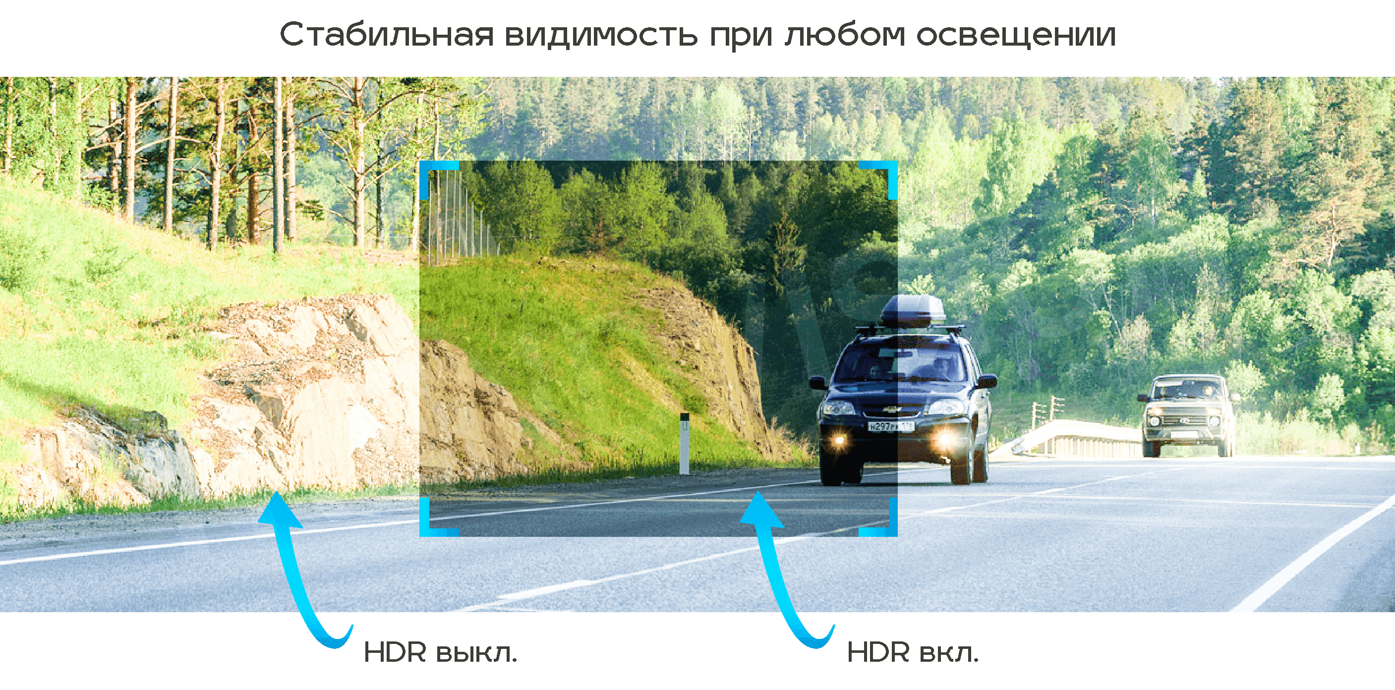 Программная функция HDR обеспечивает доступную видимость деталей в кадре при самых сложных условиях съёмки: при слишком сильном/слабом освещении или его резком изменении (например, при въезде в тёмный тоннель).