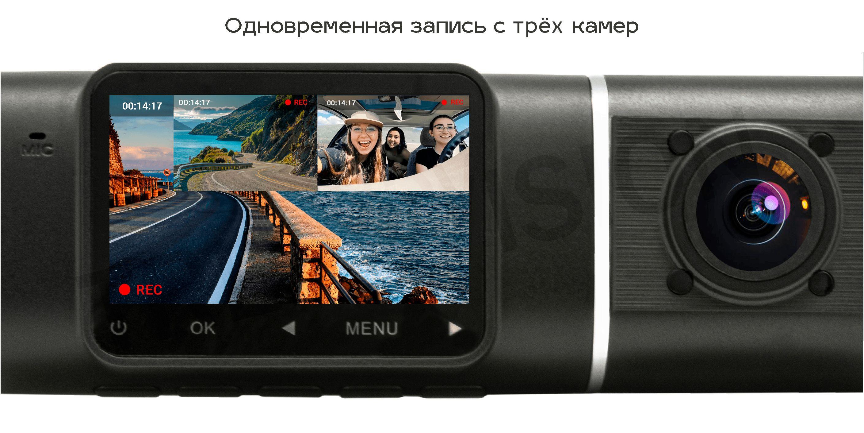 - Одновременная запись событий спереди, сзади автомобиля и в салоне