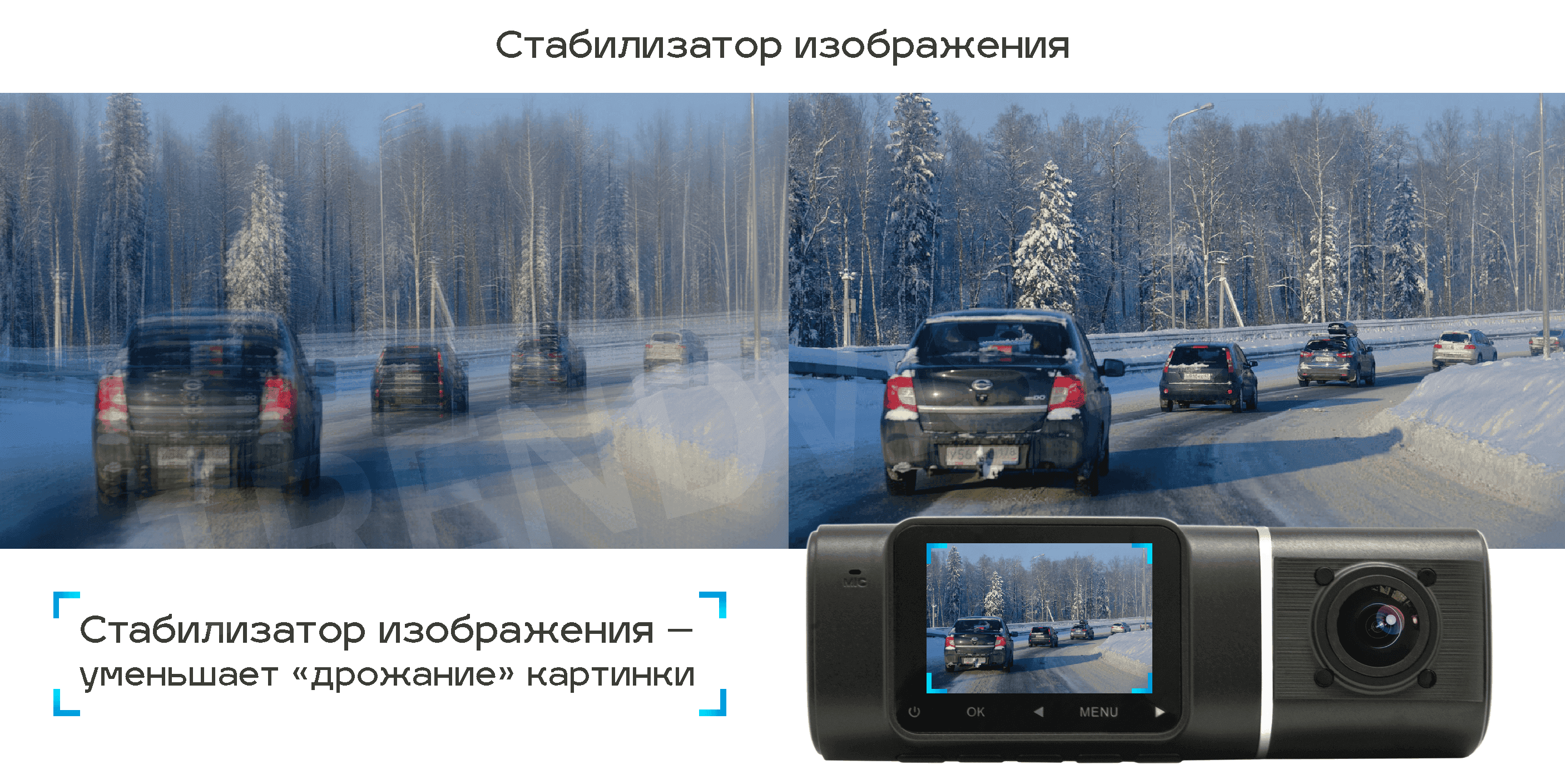- Стабилизатор изображения, нейтрализующий «дрожание» кадра при движении автомобиля