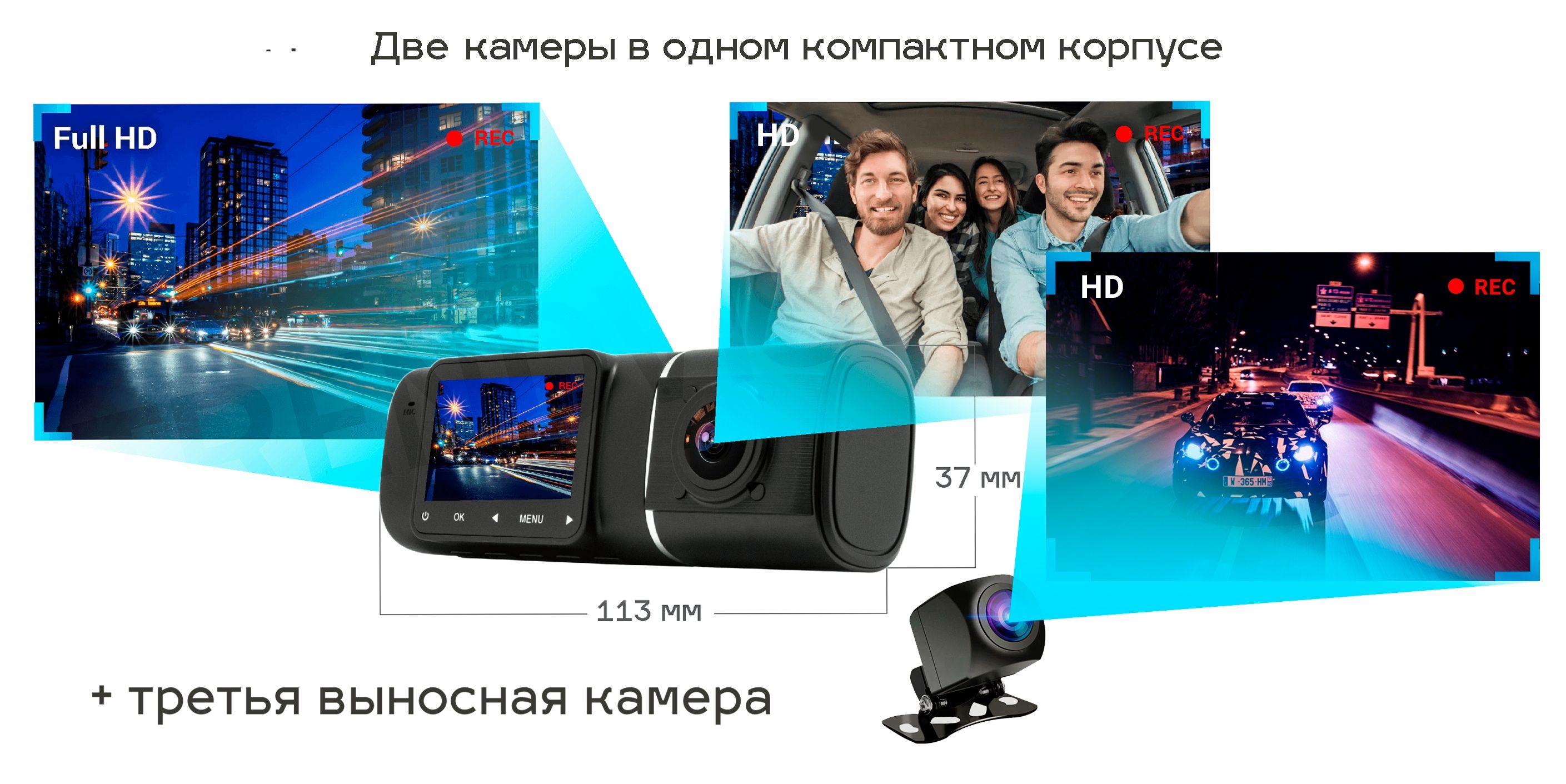 - Разрешение Full HD + HD + HD у трёх камер видеорегистратора