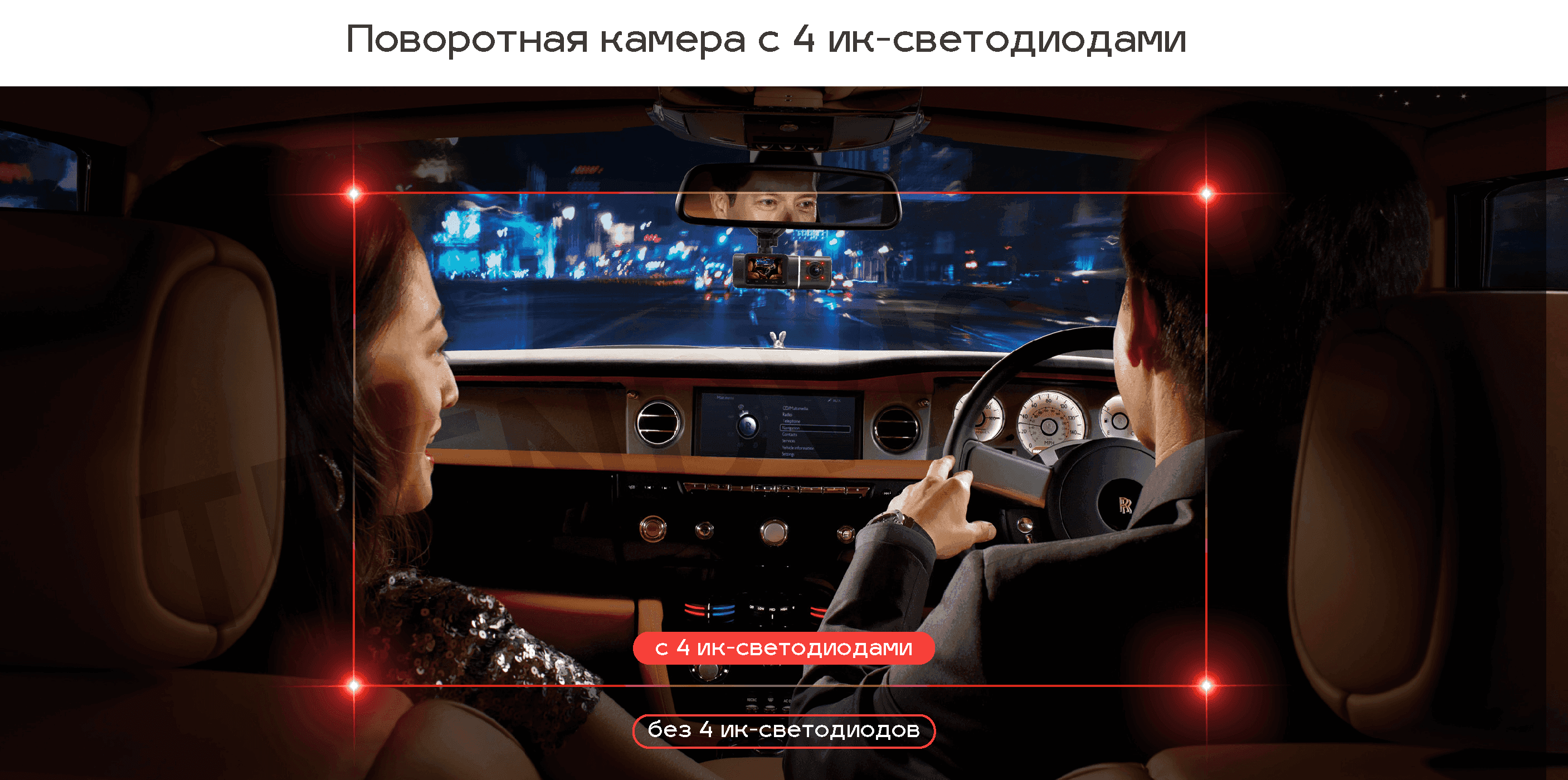 Вторая Full HD камера устройства прокручивается на 250° - есть возможность направить её в салон и фиксировать происходящее не только на дороге, но и внутри машины. К тому же, она оснащена 4 ИК-светодиодами, благодаря которым происходящее в салоне автомобиля будет видно даже в условиях полного отсутствия освещения.