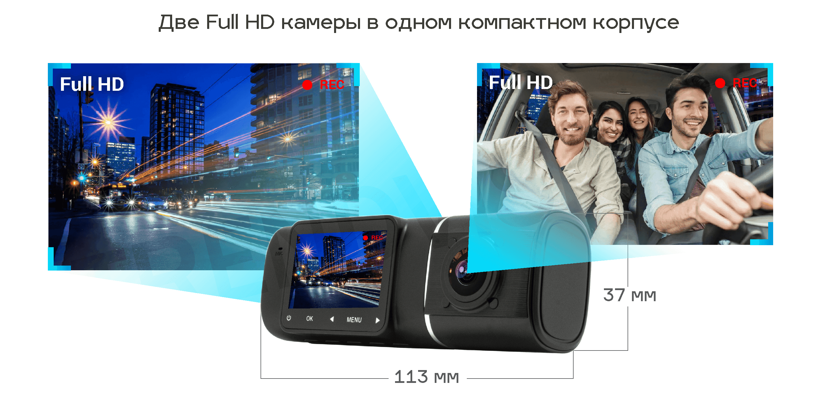 При том, что размер видеорегистратора чуть больше спичечного коробка, в его корпусе установлены две камеры. Каждая из них снимает в разрешении Full HD (1920x1080p) – это позволяет зафиксировать все важные события/объекты на дороге и детали происходящего внутри автомобиля.
