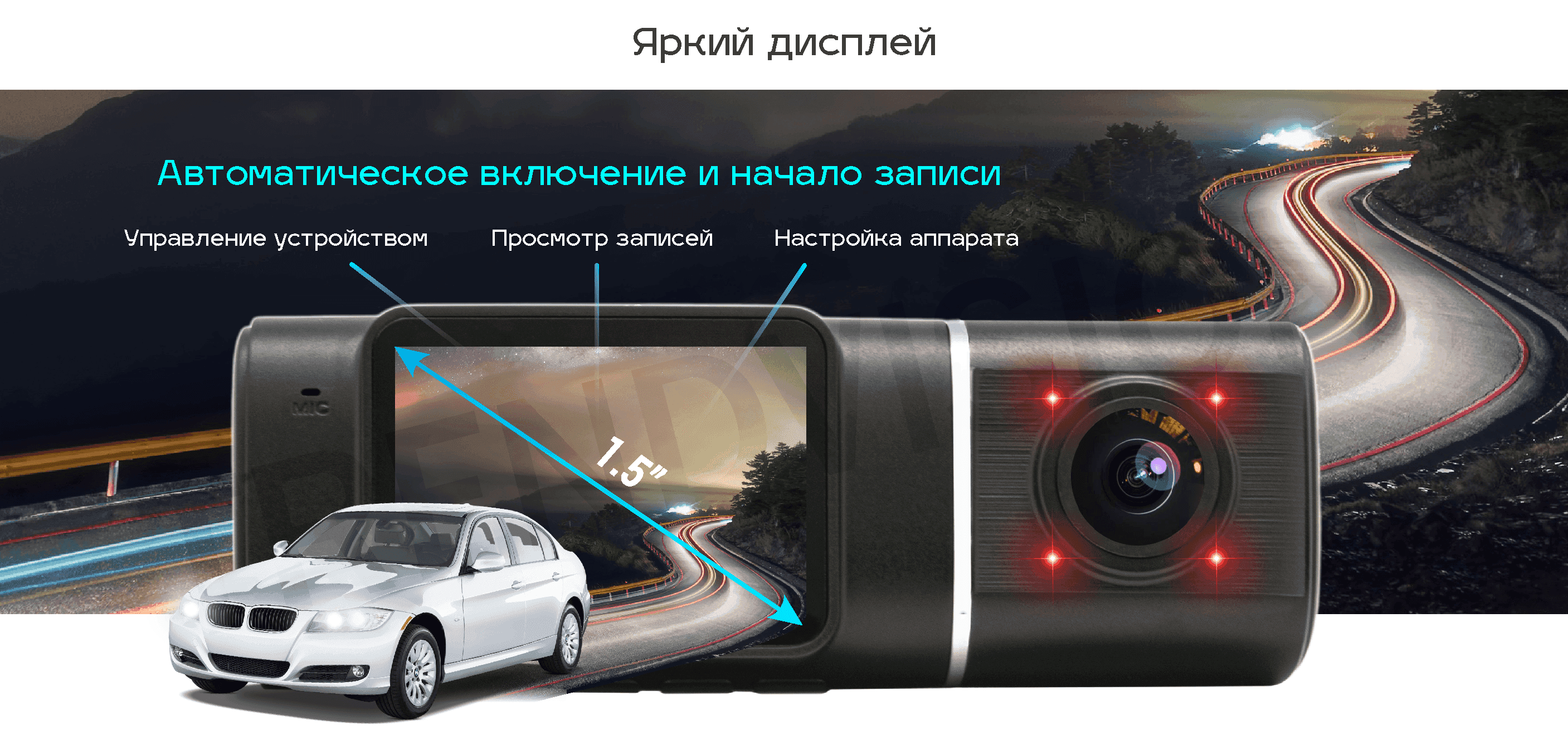 Компактный Full HD видеорегистратор с 2 камерами в 1 корпусе и 4 ИК-светодиодами для ночной съёмки. GPS-модуль в комплекте.