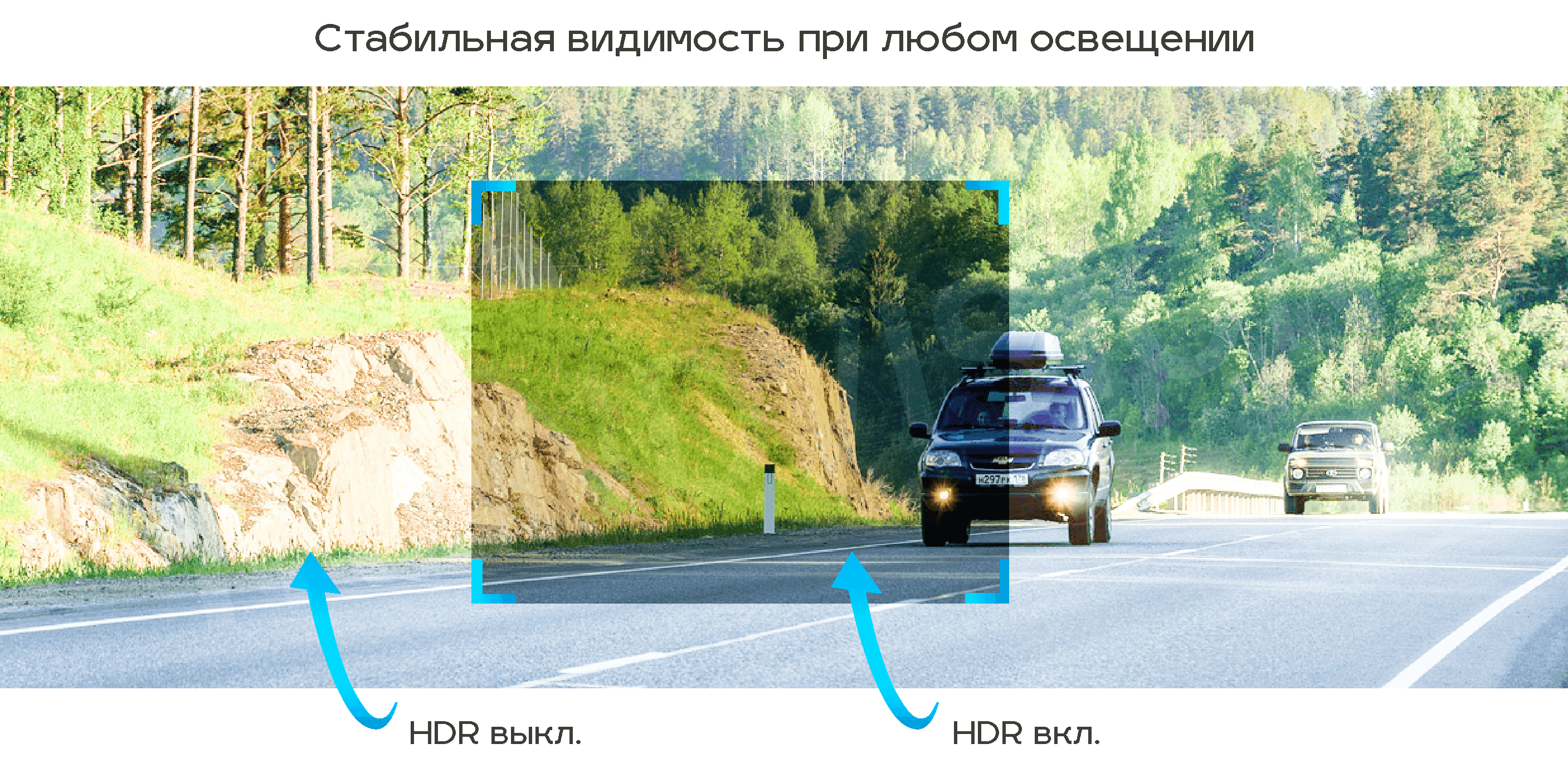 Программная функция HDR обеспечивает доступную видимость деталей в кадре при самых сложных условиях съёмки: при слишком сильном/слабом освещении или его резком изменении (например, при въезде в тёмный тоннель).