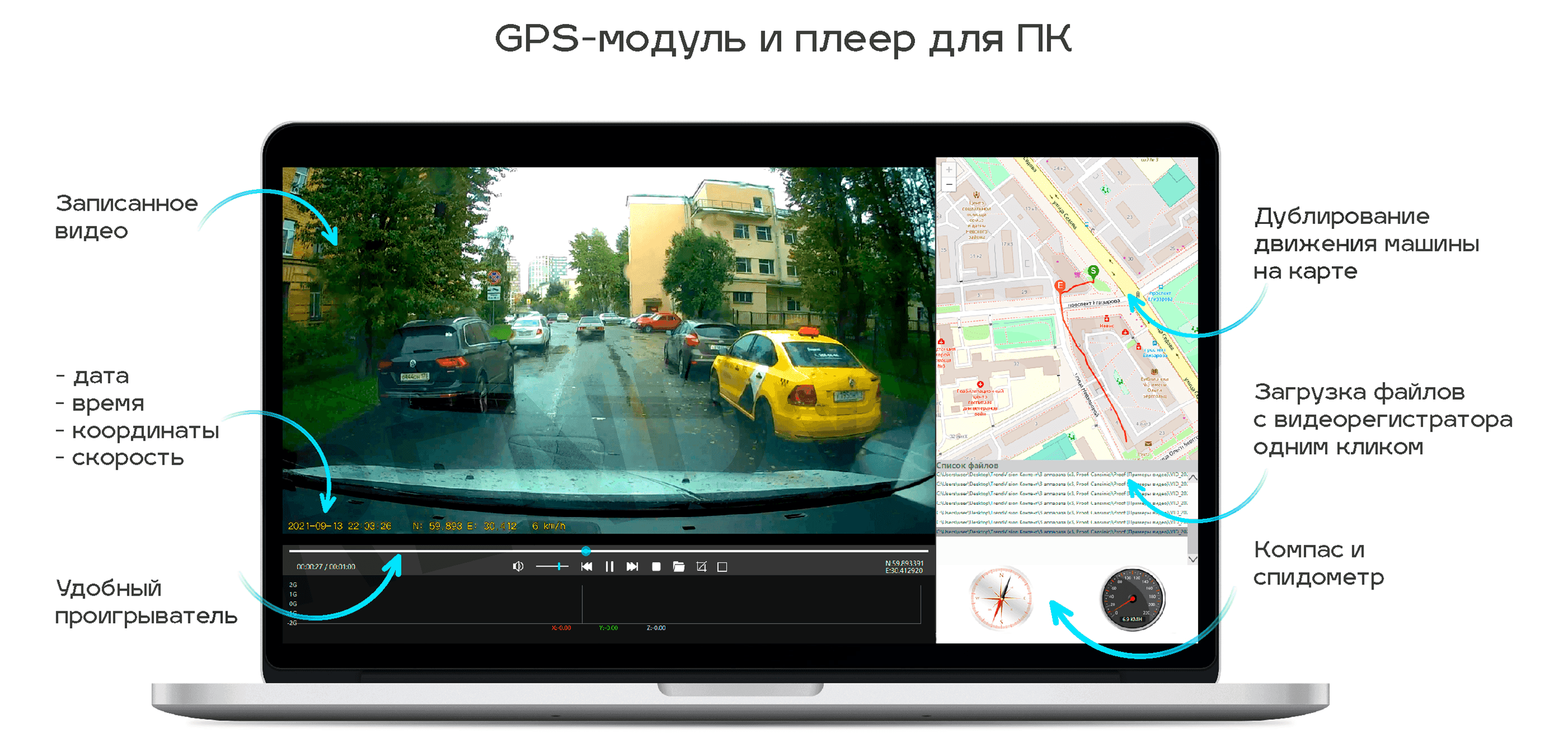 Выносной GPS-модуль обеспечивает водителя актуальной информацией о скорости движения автомобиля, координатах, времени и дате. А если скачать плеер для ПК «GXPlayer», то можно просматривать записи с видеорегистратора на экране монитора, получая данные об автомобиле в синхронизации с его передвижением на видео – метку на карте, координаты, скорость, дата, время и так далее.
