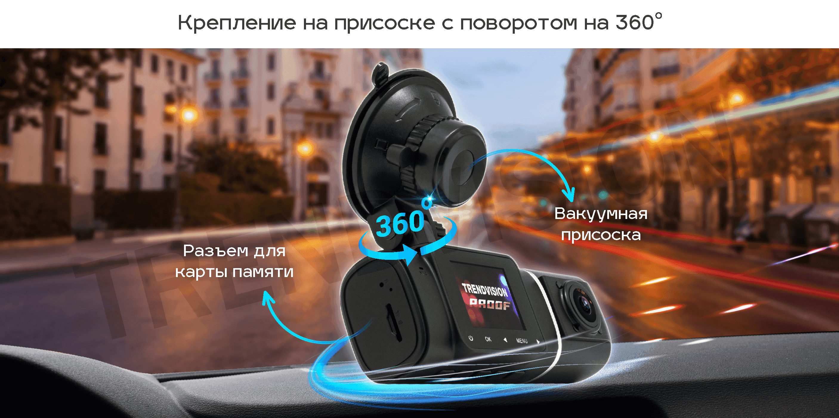 TrendVision Proof PRO GPS – автомобильный видеорегистратор с двумя Full HD камерами в одном компактном корпусе. Одна из камер вращается на 250° и имеет 4 ИК-светодиода – это позволяет вести съёмку одновременно как дороги перед машиной, так и ситуации внутри салона, при любых условиях освещения. GPS-модуль, автоматически определяющий дату, время, скорость и координаты - в комплекте.