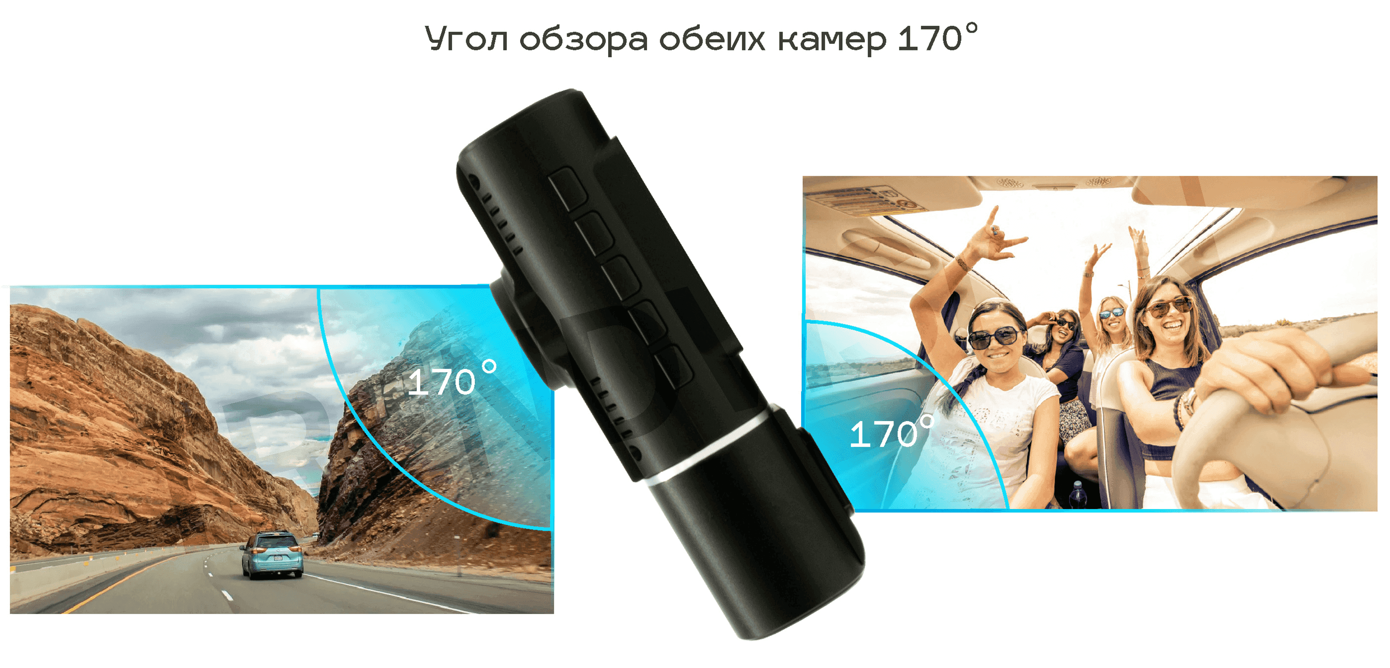 Угол обзора обеих камер составляет 170гр. Передняя камера фиксирует не только проезжую часть, но и пешеходные зоны. В обзор второй камеры попадает всё пространство салона автомобиля.