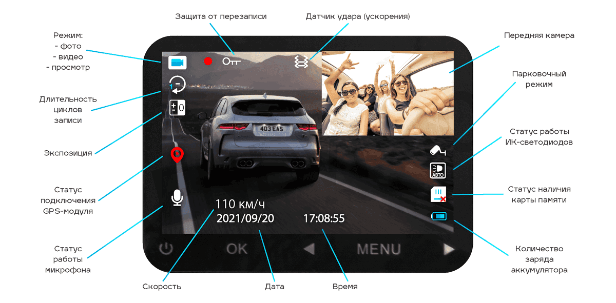 - Одновременная запись событий на дороге и в салоне автомобиля