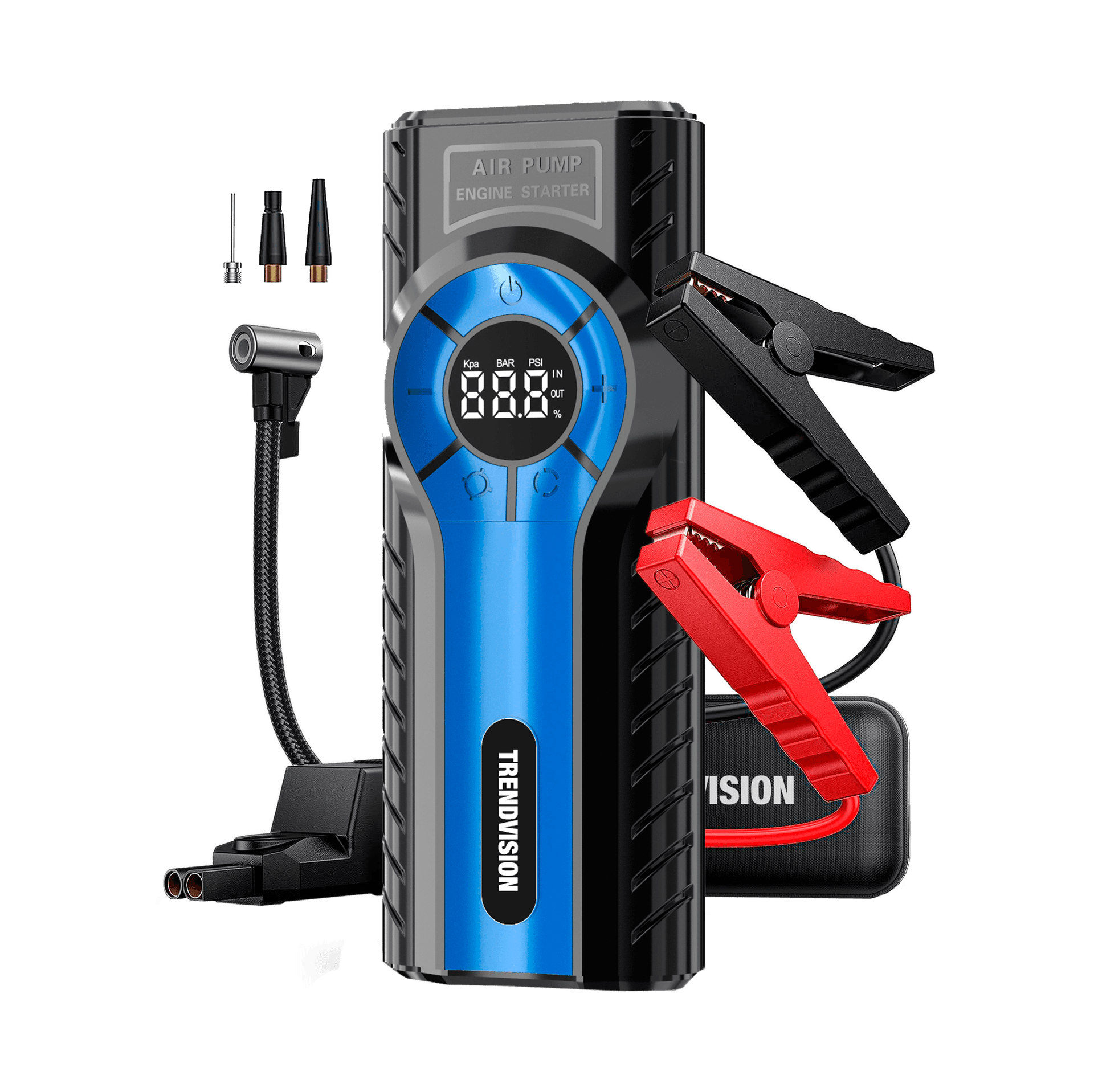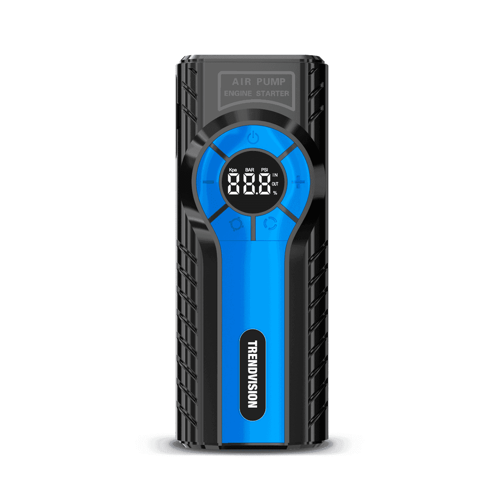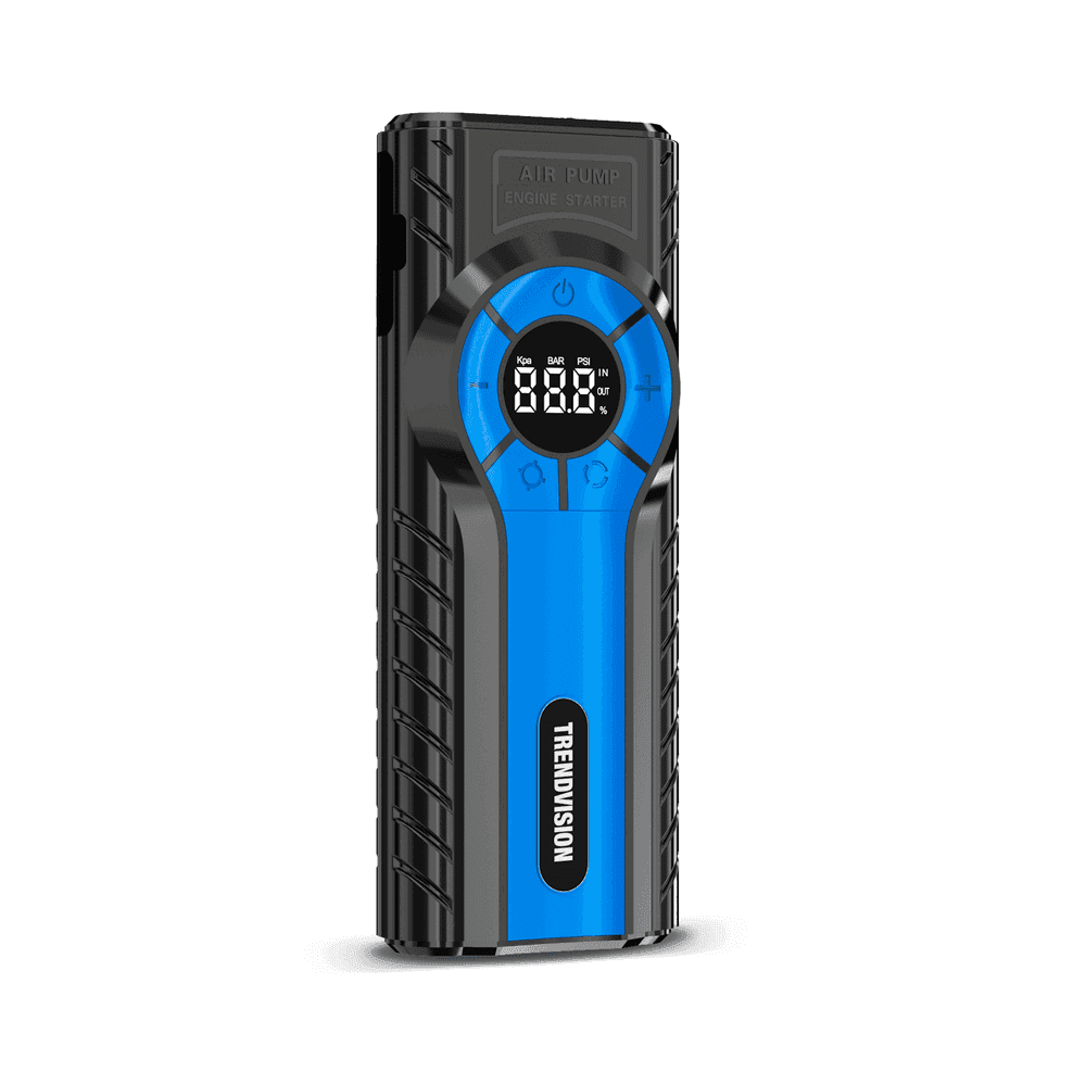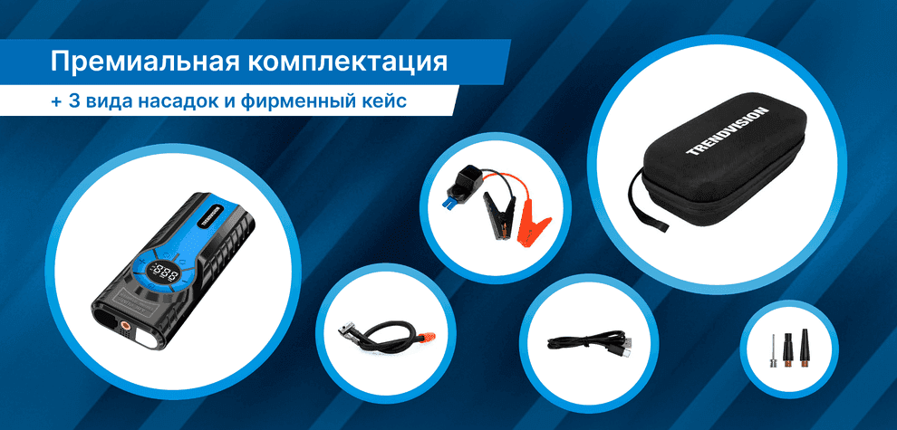 TrendVision Start Compressor - 4 в 1 мультифункциональное устройство (пуско-зарядное устройство, беспроводной компрессор, power bank, фонарик). Данный аппарат может запускать двигатель любых транспортных средств с разряженным штатным аккумулятором или при затрудненном запуске двигателя в зимнее время года. Помимо этого, есть возможность быстро и легко подкачивать колёса транспорта с помощью беспроводного компрессора или заряжать любые гаджеты с помощью функции "Power Bank".