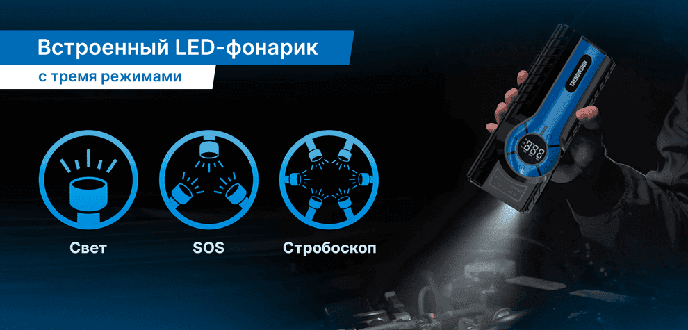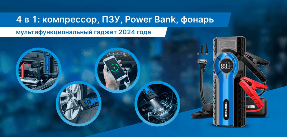 Одно устройство объединяет в себе компрессор, пуско-зарядное устройство, power bank и фонарик, уменьшая количество необходимых инструментов для поддержания функциональности и мобильности автомобиля.