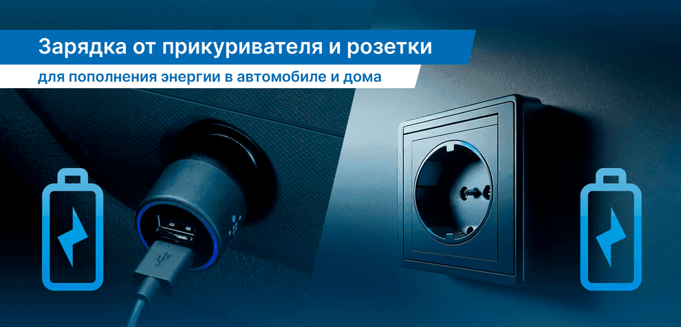 - Возможность зарядки от прикуривателя авто и от домашней розетки